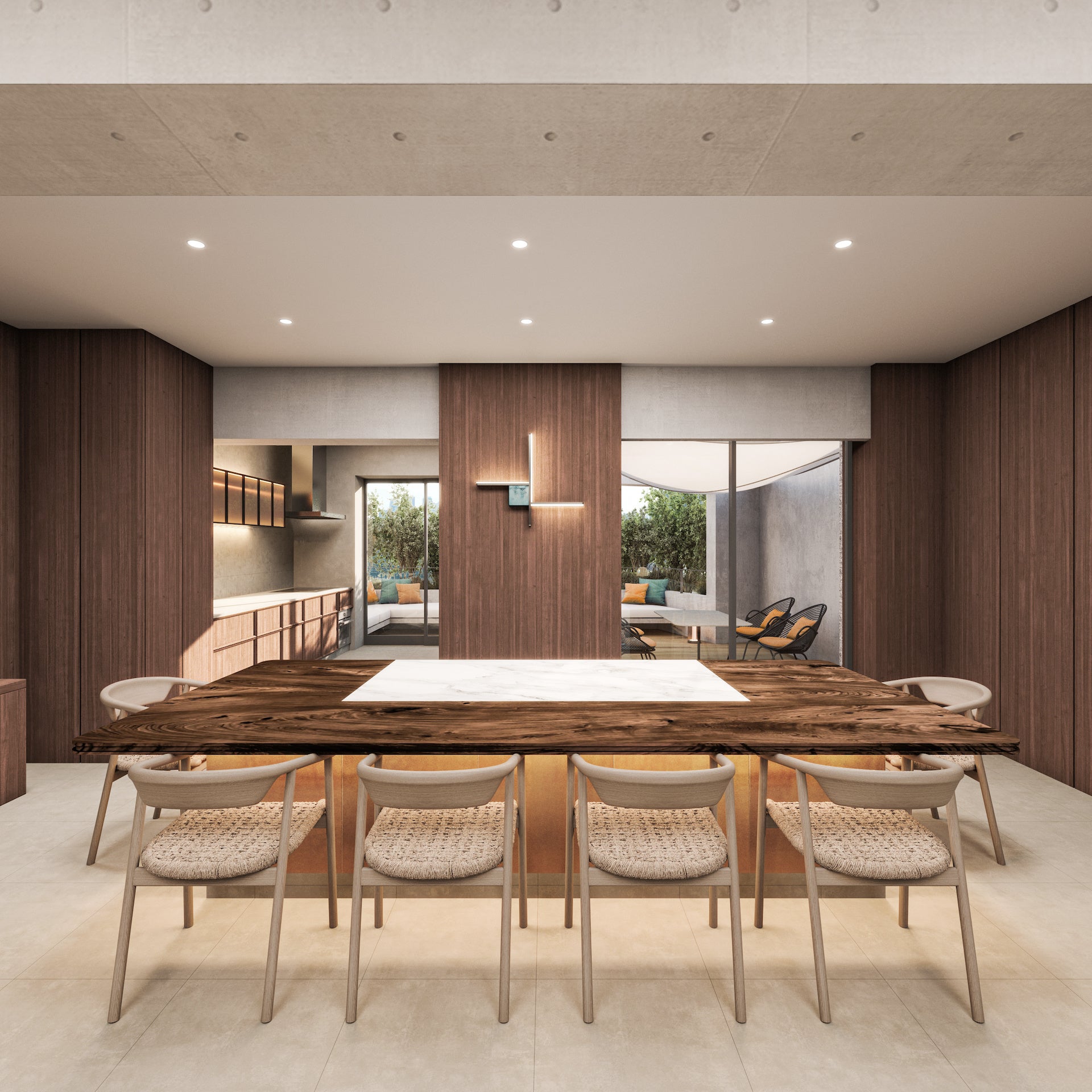 気心の知れた仲間や友人と楽しむ2つの食卓。調理のライブ感を楽しむシェフズテーブルと約30㎡の広々としたテラスダイニング。気分によって2つの食のシーンを楽しめる美食の家。