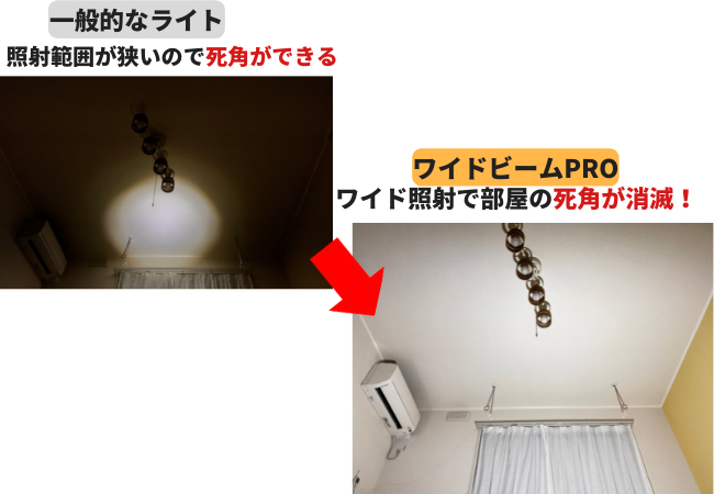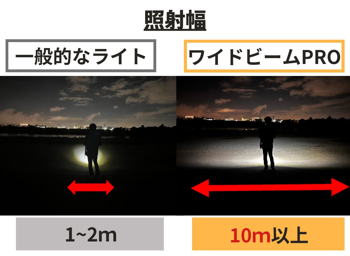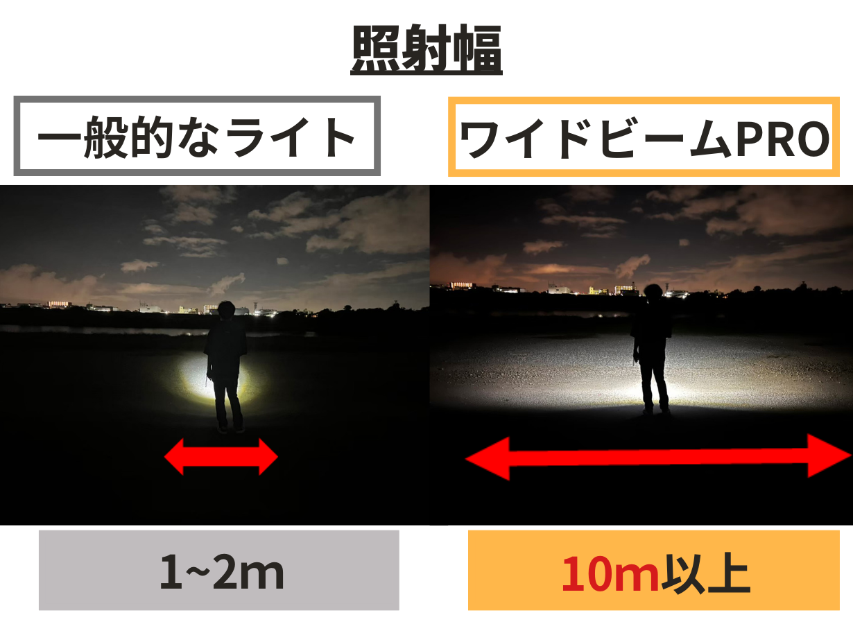 実際にワイドビームPROの照射角度が従来の懐中電灯とどれだけ違うのか、詳しく理解して頂くために「照射角度」と「照射幅」の2方面で比較してみました。