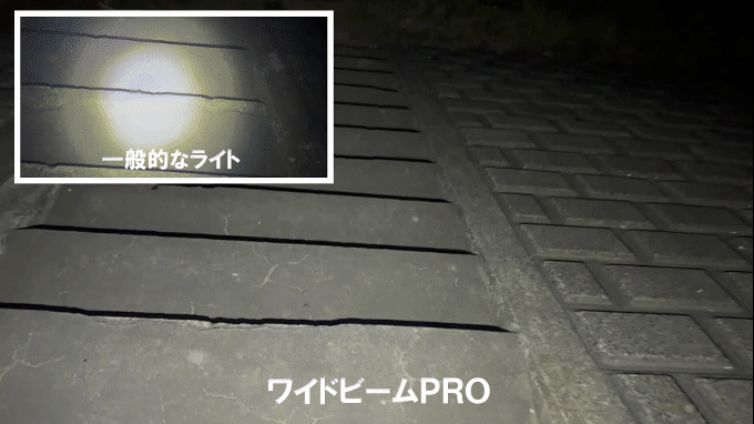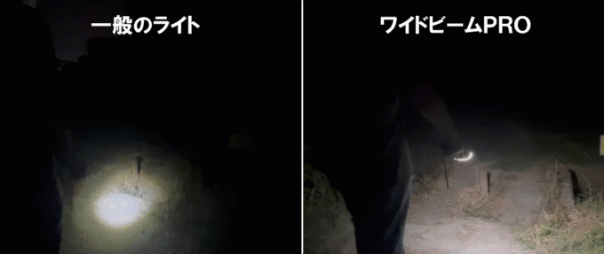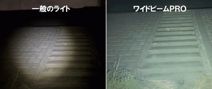 一方で、ワイドビームPROは光の届く範囲が上下左右とも圧倒に広く、人の視野角とほぼ同じです。夜でもまるで真昼のように視認性が高く、ライトを動かす必要がありません。