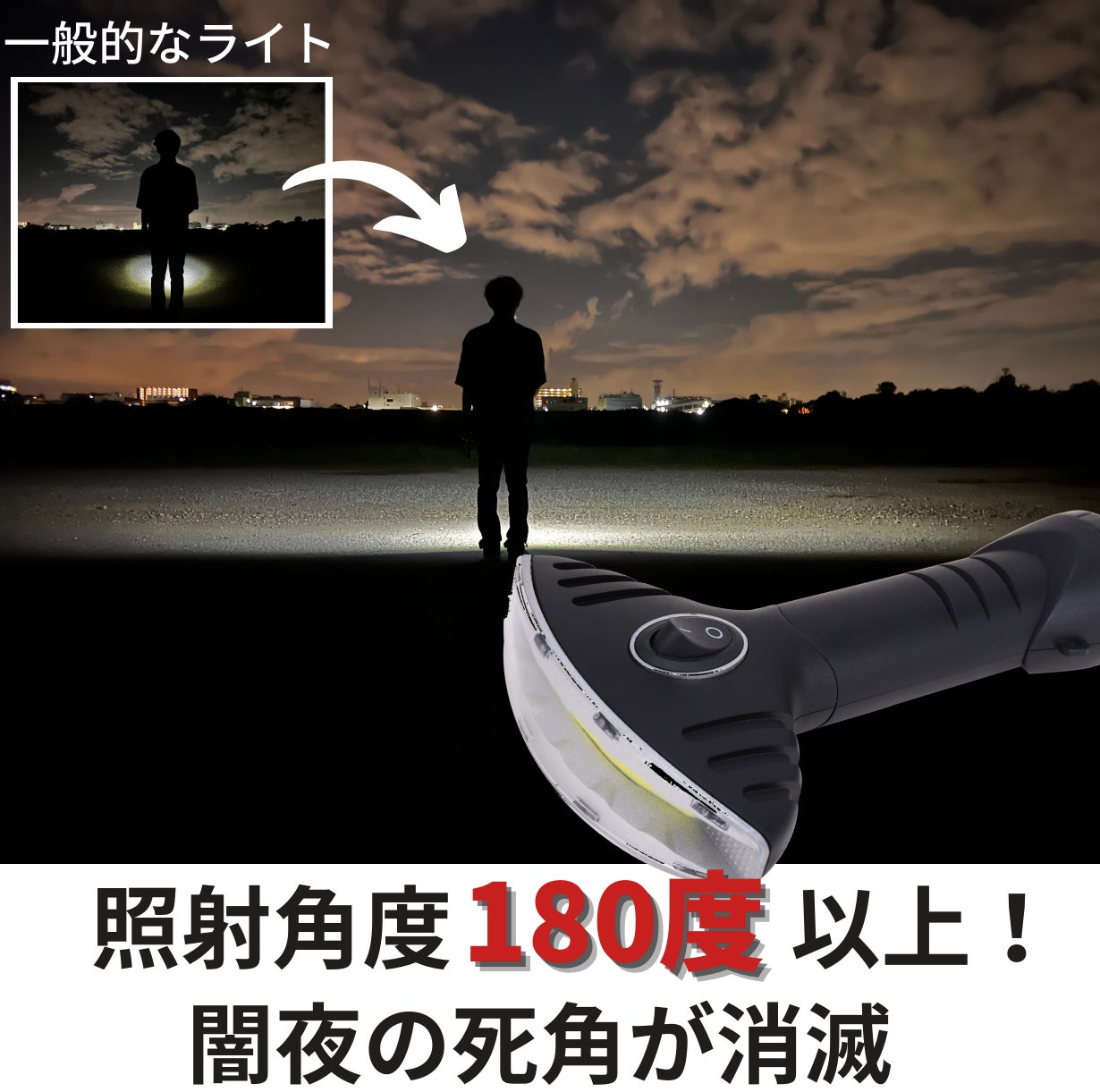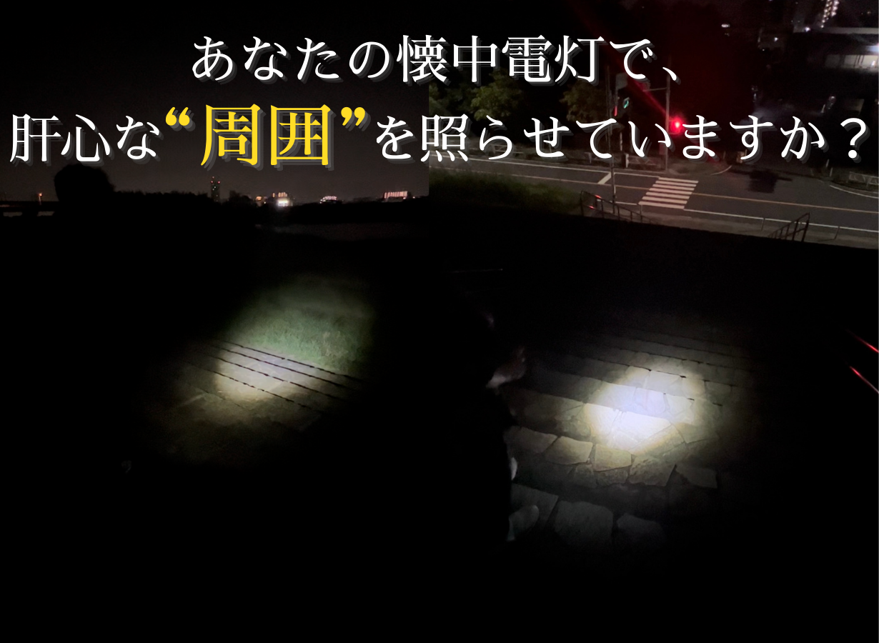 従来の懐中電灯は照射角が狭く、光が届く範囲は限定的です。そのため、あなたが行動するたびに、ライトを上下左右に動かして周囲を確認する必要がありました。