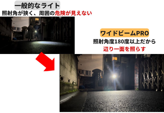 ワイドビームPROは、180度以上の広範囲を照らす新しい懐中電灯です。扇形のヘッドライトに24個ものLEDを搭載し、350㏐(ルーメン)の明るい光で前方を照らし出し、暗闇から飛び出てくる危険をいち早く察知できます。