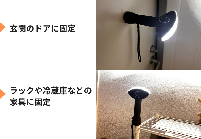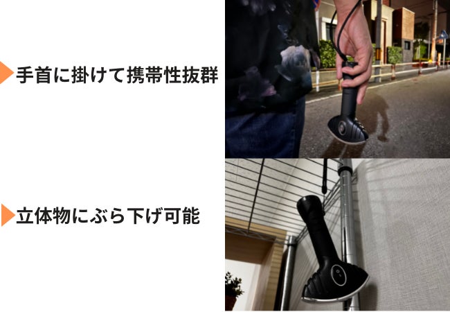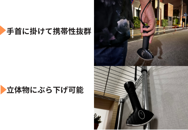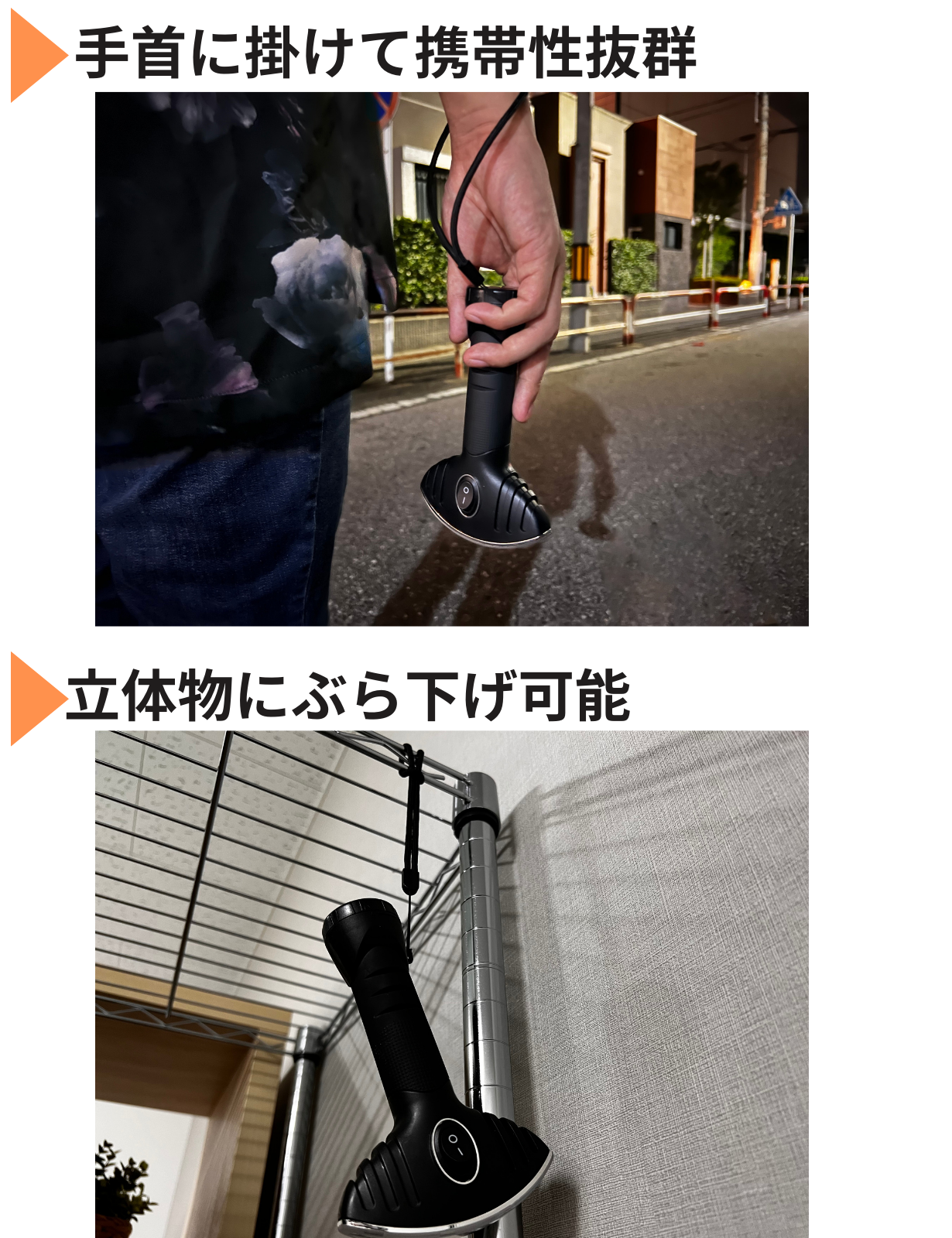 ふとした弾みでハンドルから手を放しても落下しないようにワイドビームPROでは手首まですっぽり収まる長めのストラップを取り付けました。木の枝やポールなどにもぶら下げられるので、アウトドアなどではランタン代わりに使用が可能。バックパックでカラビナを使ってぶら下げて歩けば、使いたい時にすぐに使えます。