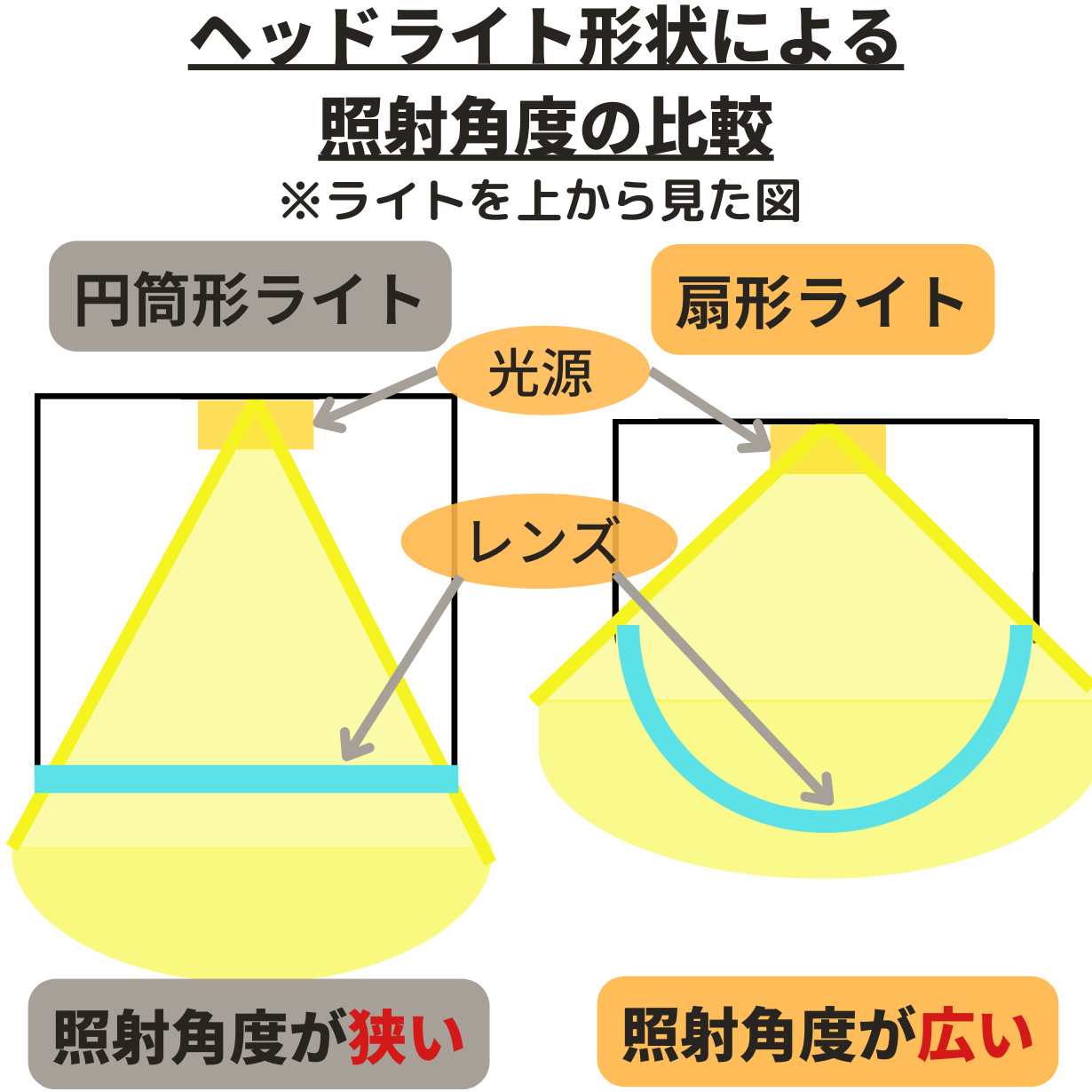 基本的に光は真っ直ぐ進むもの。どんなに光量の大きさを強調する懐中電灯でも、光が作り出す「視野角」はヘッドライトの大きさに比例します。