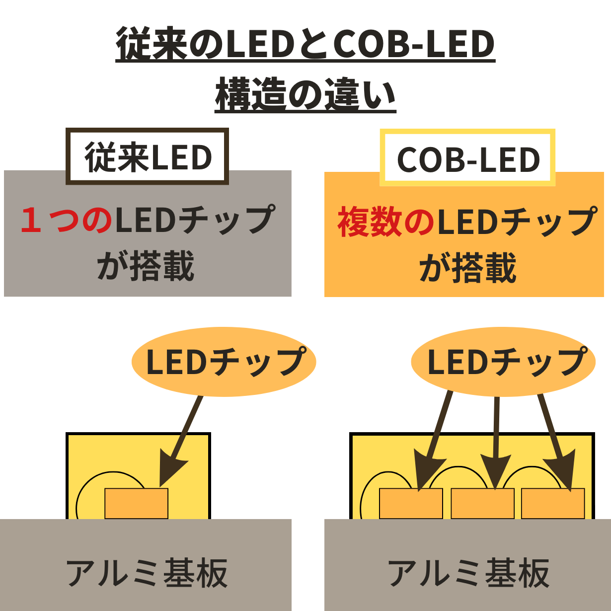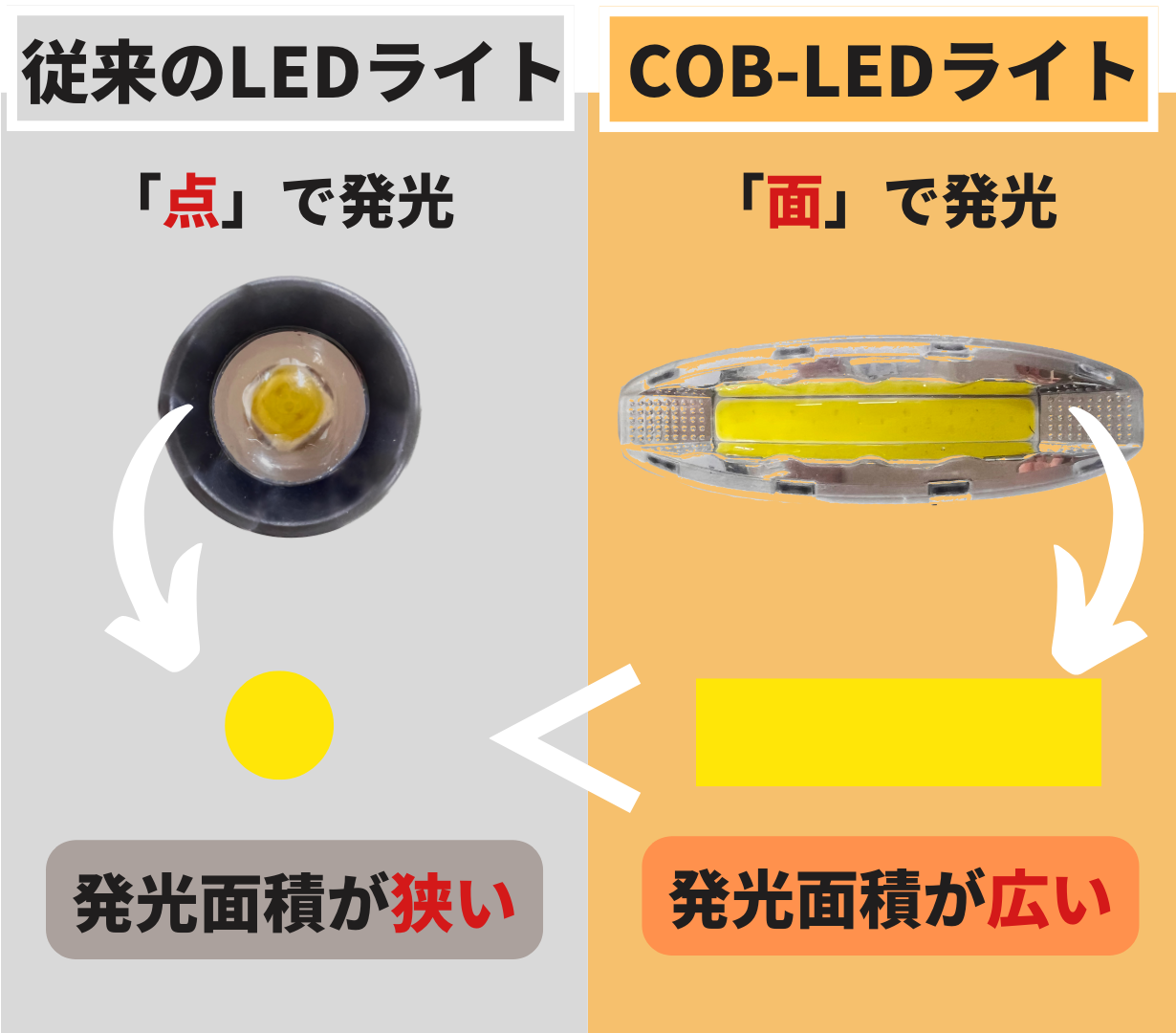 COBライトとは近年開発されたLED光源の一つ。COBとは「Chip on Board」の略で、一般的なLEDライトが電球の「点」で発光するのに対し、COBライトは基盤(ボード)にLEDチップが直接載っており「面」で発光します。