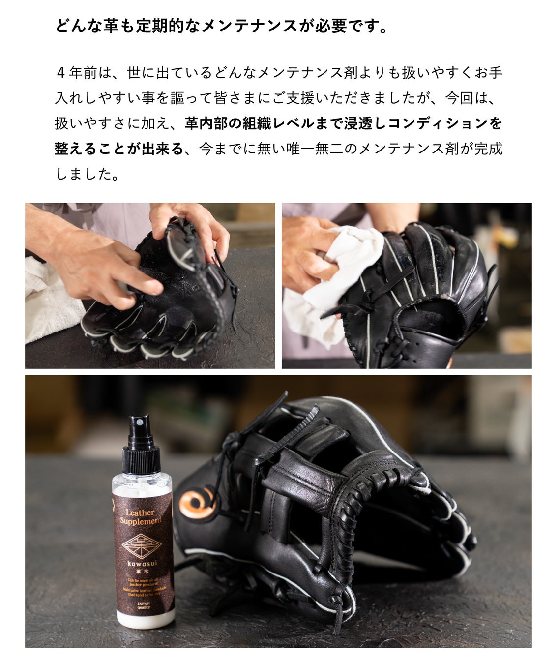 「レザーサプリメント」は厳選された天然成分を配合し、革製品の表面に付いた汚れやホコリをやさしく落としながら、革本来の柔軟性としなやかさを保ち整えることができる。独自の保護成分が革の表面や内部組織に浸透し革全体を成分で満たすため、シミになりにくく、汚れから革をまもる効果も期待できる。