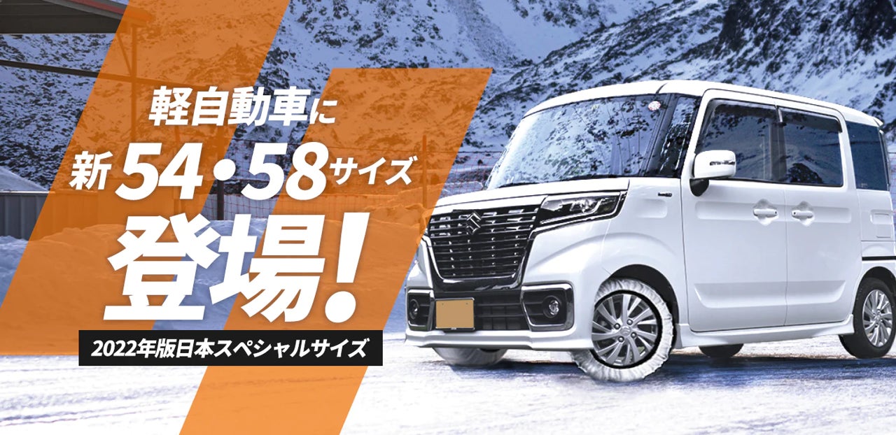 わずか6サイズで、軽自動車で使われる幅の狭いタイヤからSUVの大口径タイヤまで、市販されているほぼ全てのタイヤで装着可能。また大型車両用に対応する唯一の布製タイヤチェーンでもあります(大型車両用のサイズ展開は14サイズ)。