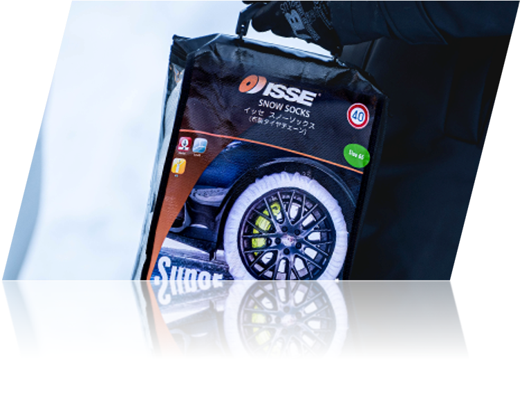 イッセ・スノー ソックスはバルセロナのイッセ社が開発・ 製造する布でできたタイヤチェーンです。日本においては2019年の販売開始以降、全国の大手自動車用品店やタイヤショップ、ホームセンター等で次々と配荷を果たし日本市場向けの輸入量は3年で20倍以上に飛躍しました。また欧州自動車メーカーのインポーターにおいて純正アクセサリーに採用されているほか、ロードサービスや道路維持補修の場での活躍も始まり、冬のドライブを支える力強いアイテムとして注目されています。