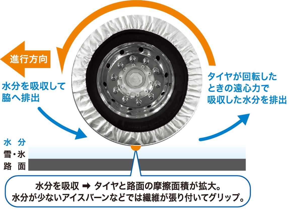 イッセ・スノーソックスはなぜ雪道でグリップするのかタイヤが雪に接すると瞬間的に雪が溶けて水の膜が発生します。この水分がスリップの原因となります。イッセ・スノーソックスの表面は糸が立体的に編み込まれ、大変に厚みのある作りになっています。これが水分をしっかりと吸収・排出するため、タイヤと路面の摩擦面積が広がり確かなグリップを生み出します。水分の多い雪道や、シャーベット状になりやすい都心の路面でも安心して走行できるのはこのためです。