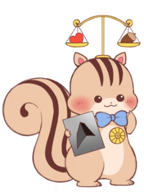 弁護士の助手を務め、日々YouTubeに関する法律問題を猛勉強中。胸には弁護士バッチ、右手にはモノリス板、頭上の天秤には愛とどんぐりを乗せています。