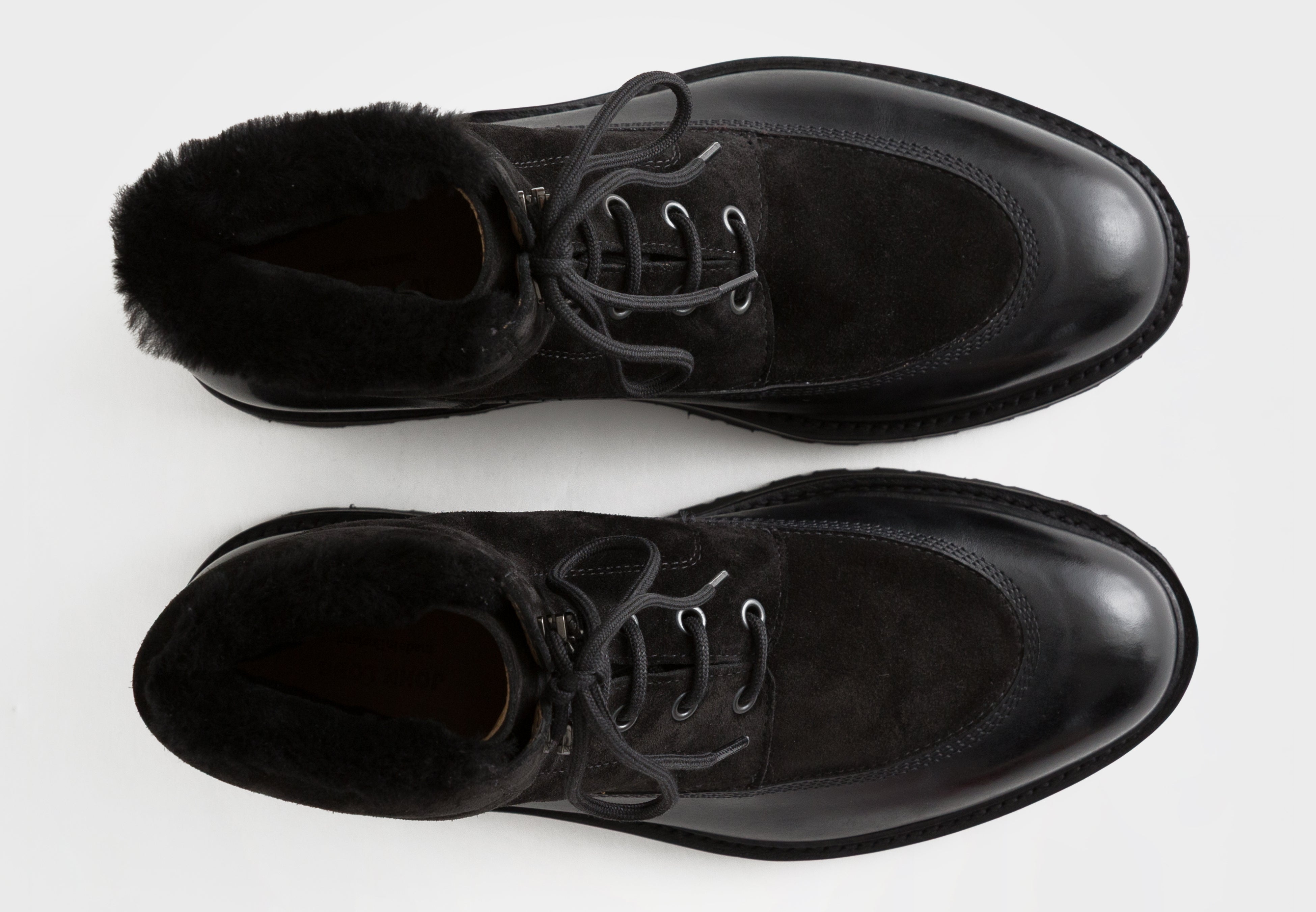 軽さと快適な履き心地で人気のブーツPEAKには、天然ムートンのシアリングを施し、阪急メンズ大阪店限定色として、ブラックカラーをご用意しました。