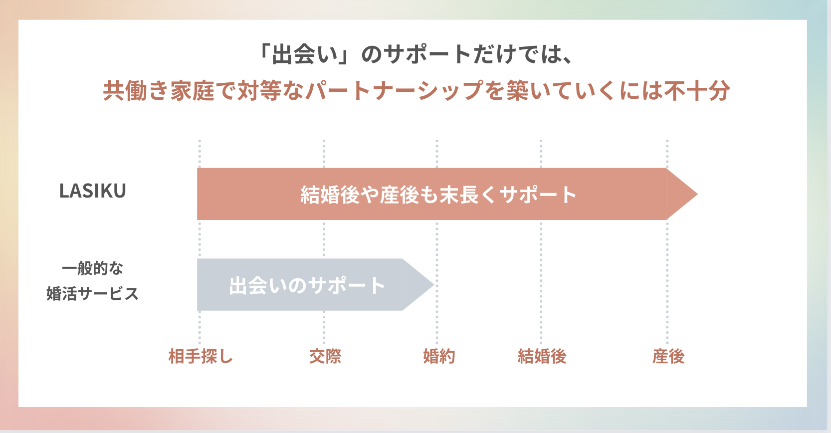 従来の婚活サービスでは婚約したら顧客は退会、サポートが終了してしまうのが当たり前でしたが、LASIKUでは、家庭運営のオペレーションが軌道乗るまでのサポートはもちろん、キャリアや産後のすり合わせなど、結婚後も長期的にサポートを受けられます。