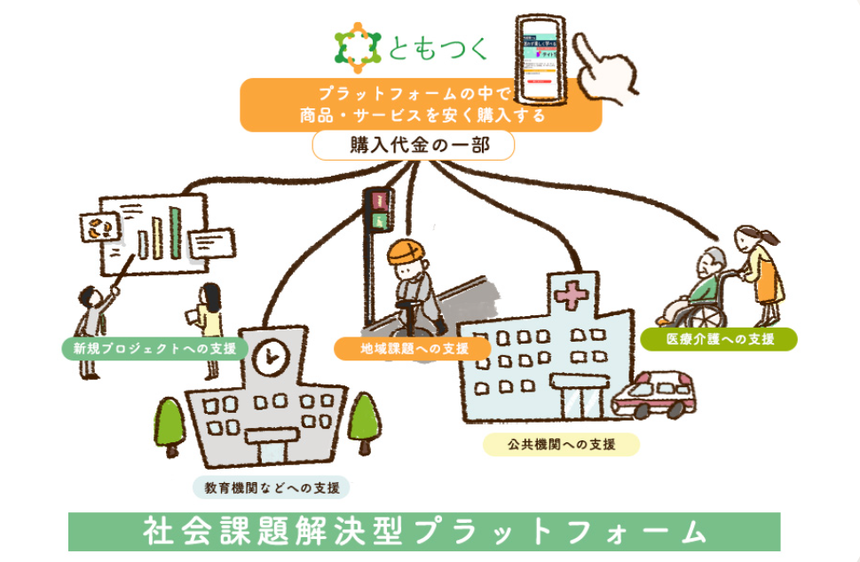 商品やサービスをお得な値段で買うことができ、さらにその代金の一部が社会貢献につながる「社会課題解決型プラットフォーム」です。