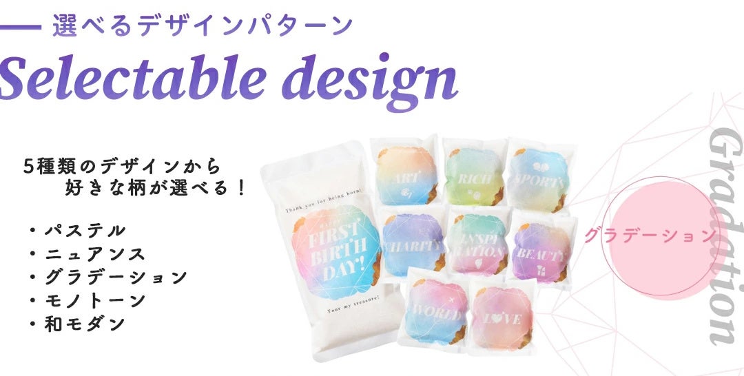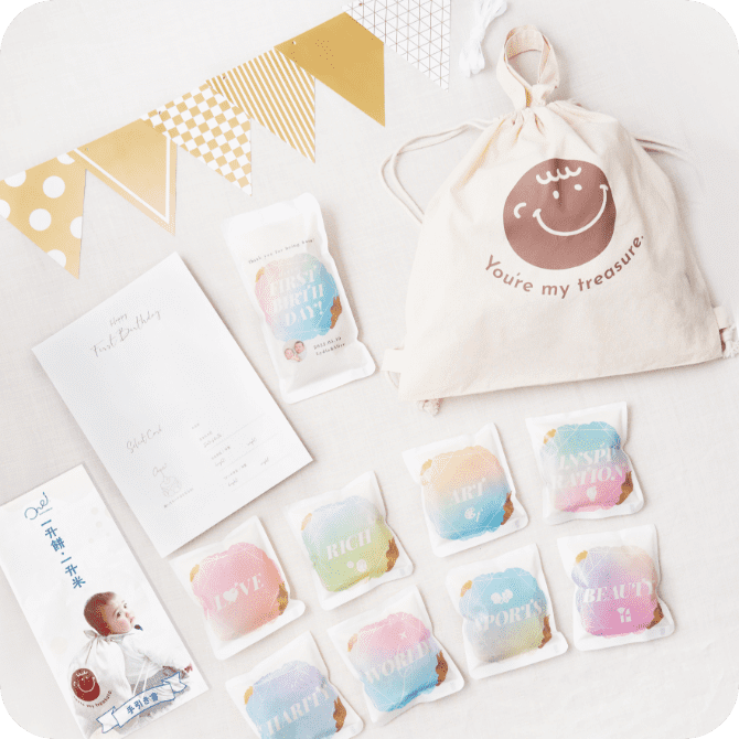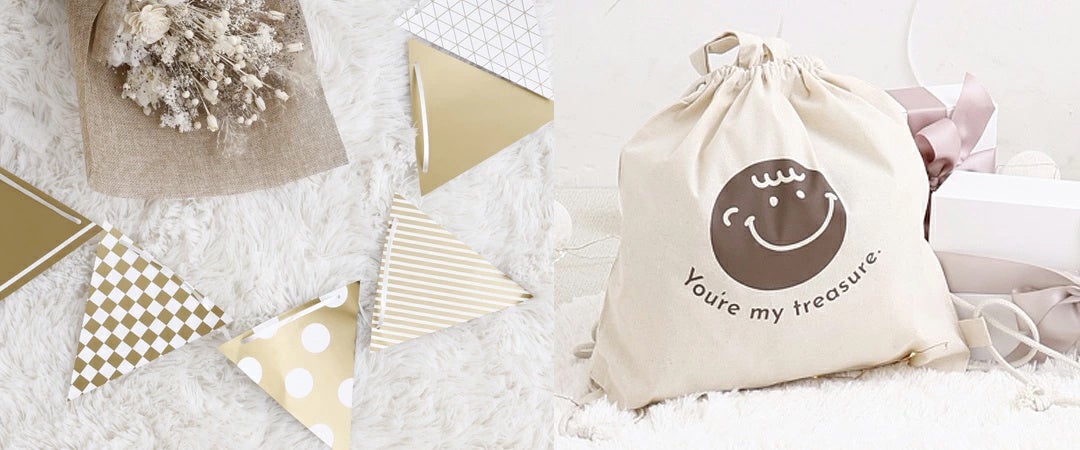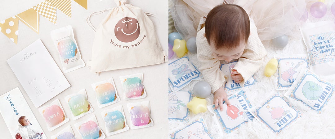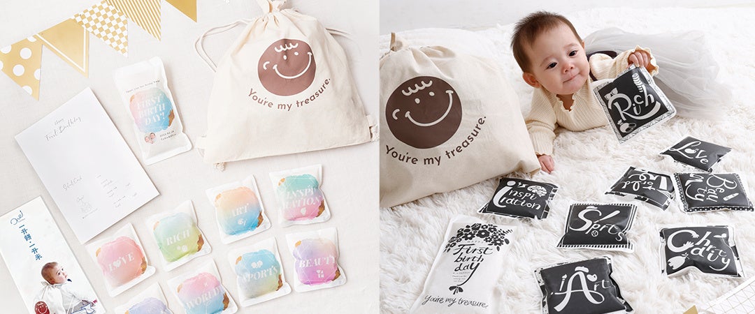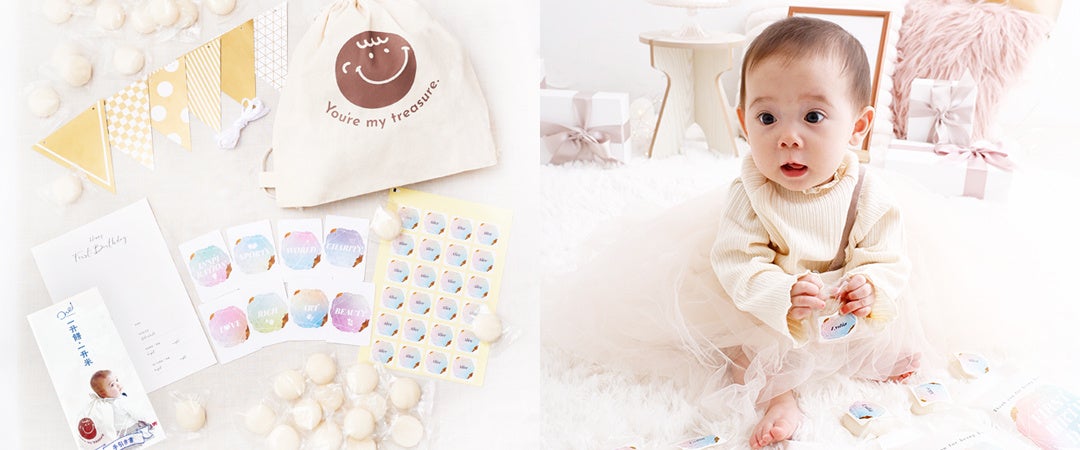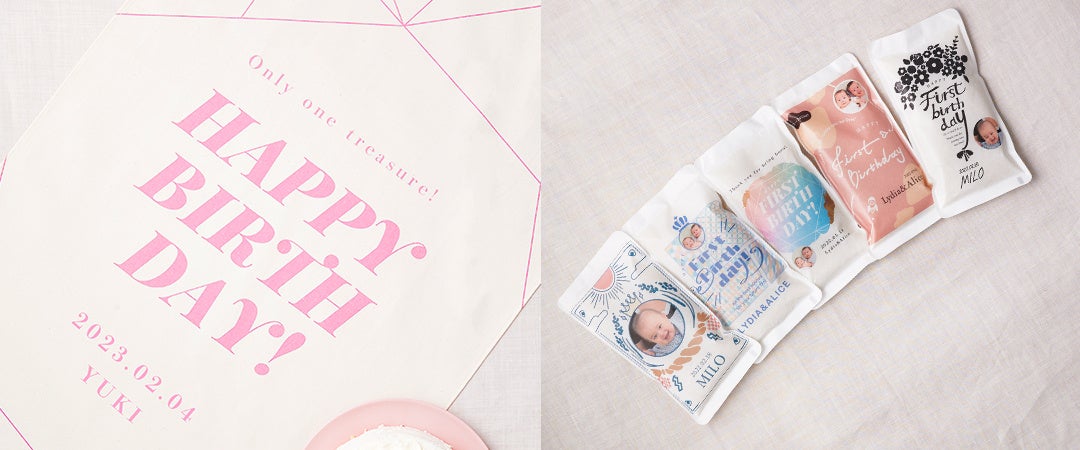 名前や顔写真を入れした商品を飾って写真を撮ったり、参加された方にお配りすることでファーストバースデイを特別な記念日として残すことができます。