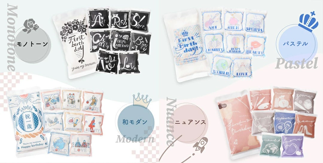 選び取りや一升餅のお祝いに必要なものがすべて揃ったファーストバースデイセットは、選べるデザインが5種類!ご家庭にあわせてお餅とお米を組み合わせてもOK!