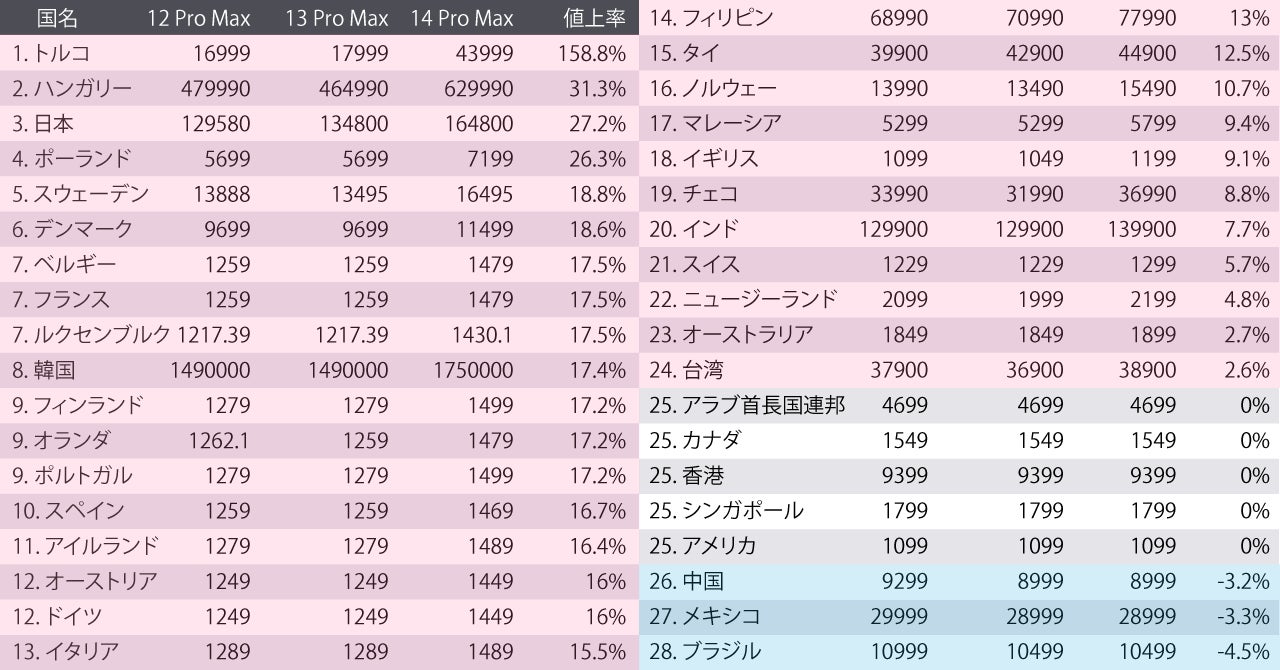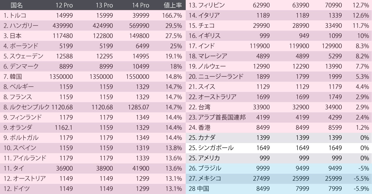 続いて3番目に値上げ率が高かったのは日本で、値上げ率は26.9%~27.5%という結果になりました。この値上げ率はアジアで最も高い値上げ率で、値上げ額で見ていくとiPhone 12→iPhone 14で+25,420円。iPhone 12 Pro→iPhone 14 Proで+32,320円。iPhone 12 Pro Max→iPhone 14 Pro Maxで+35,220円の値上げとなりました。