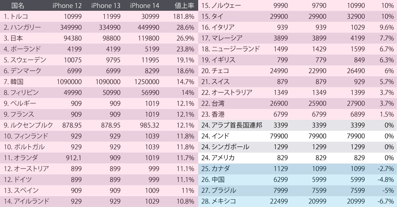 ・iPhone 12からiPhone 14の日本の値上げ率はアジアワースト1位。世界では3位