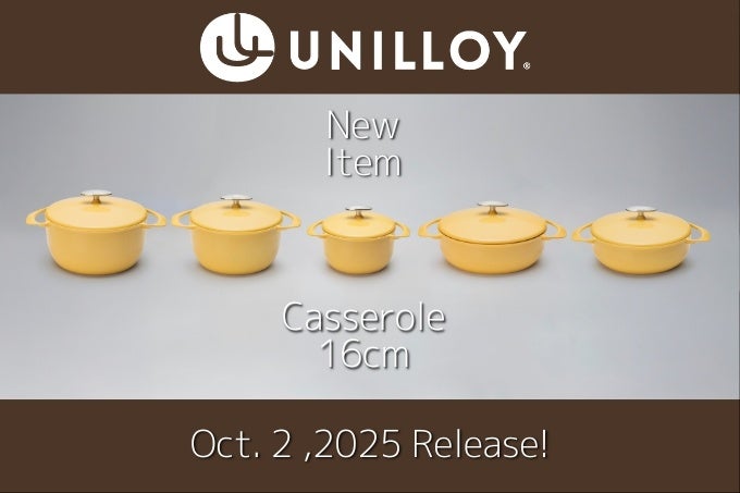 株式会社三条特殊鋳工所(UNILLOY)は、2025年10月2日より新商品「ユニロイホーロー鍋 キャセロール16cm」の販売を開始いたします。鋳物の常識を覆す軽さと美しさを兼ね備えた本製品は、日々の料理をより快適に、そして豊かに彩ります。既存の22cm深型、20cm深型、24cm浅型、22cm浅型の4サイズに続く待望の新サイズ16cm深型です。ちょっとした料理に、1~2人前のお鍋、安心安全な離乳食の調理に、幅広く活躍する鋳物ホーロー鍋です。