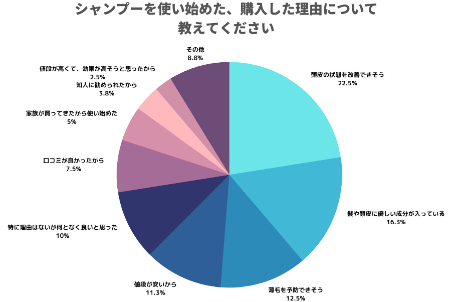 「シャンプーを使い始めた、購入した理由について教えてください」という質問に対して、多かった回答は以下のとおりです。