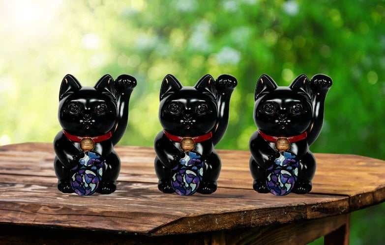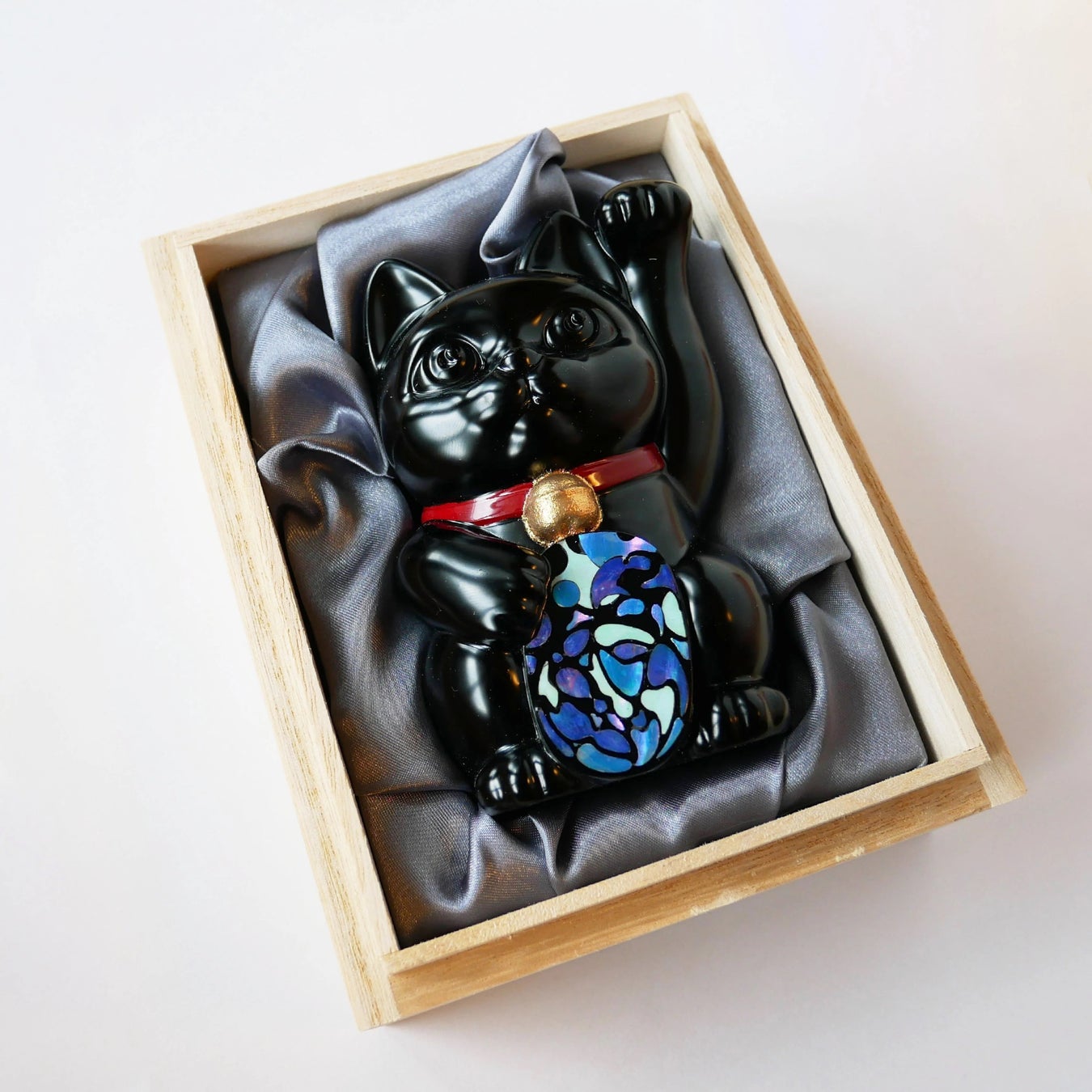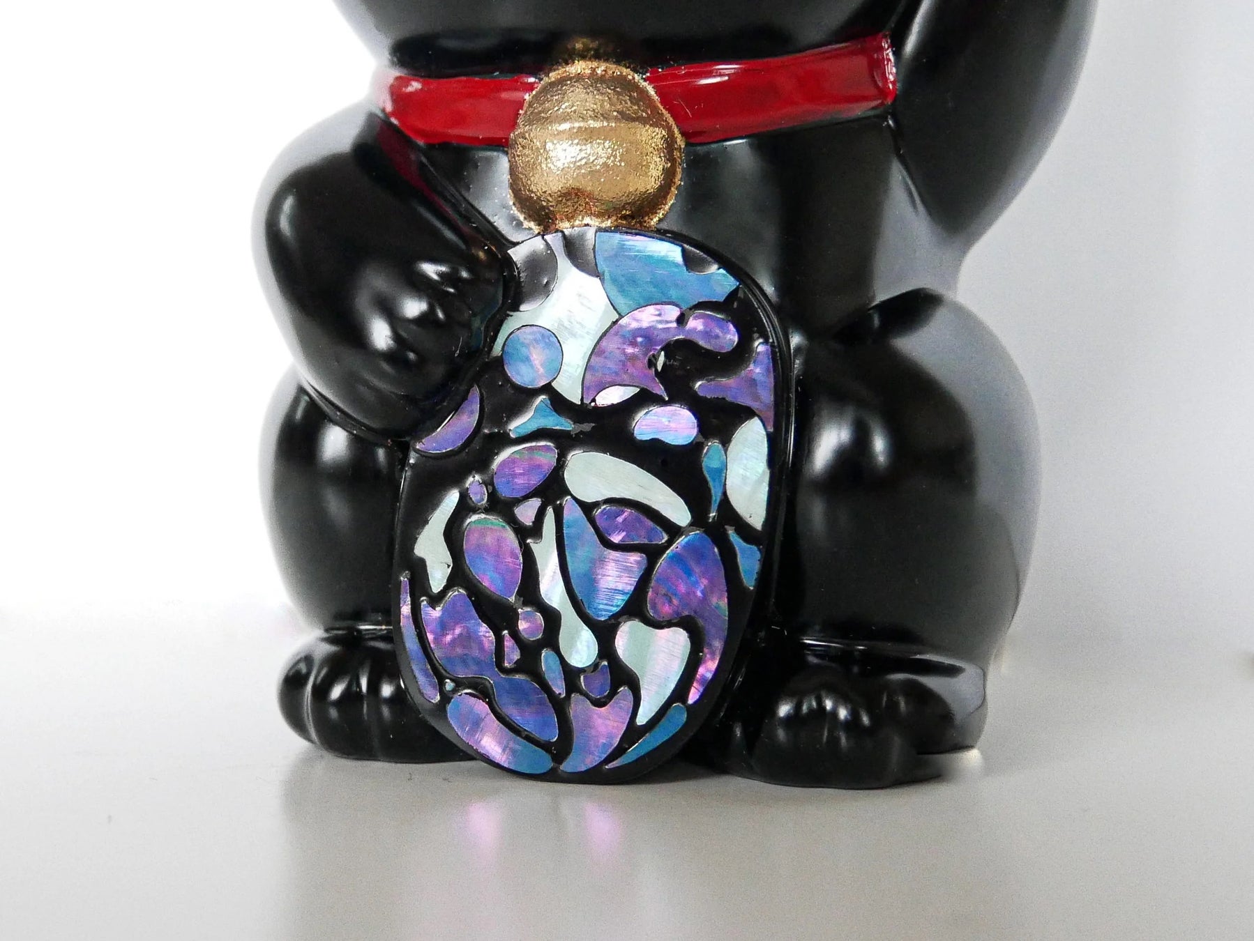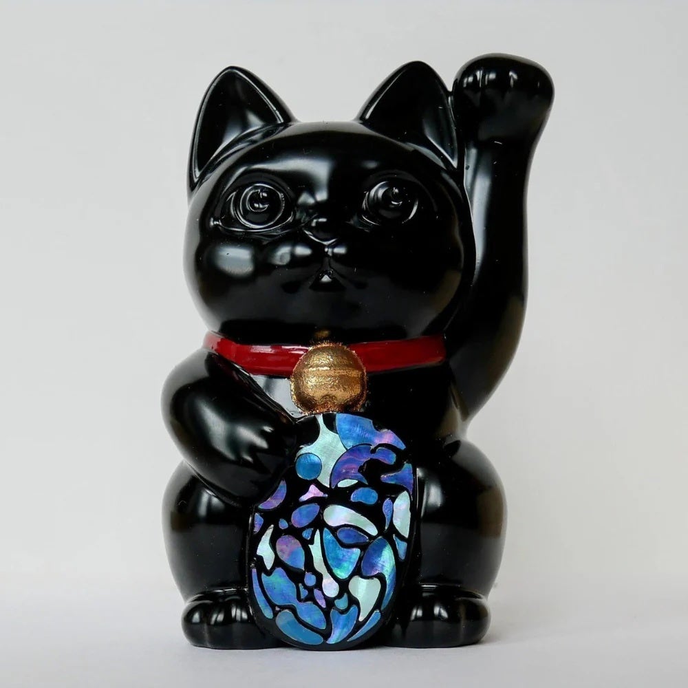 幸運の招き猫。上がった左手は集客、黒は魔除け、漆はラッキー7の意味があると言われています。幸運の輪を世界に広げることを願って心を込めて作っております。