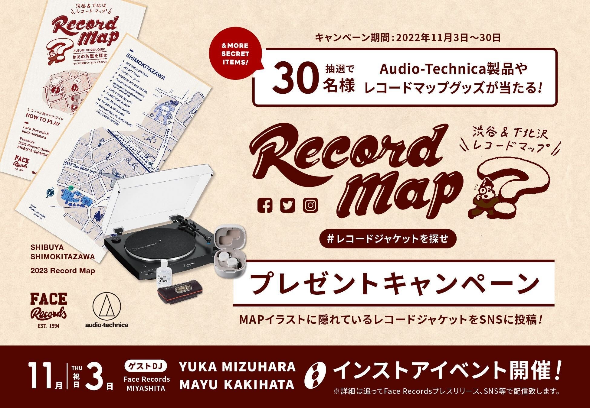 さらに、レコードマップ配布開始の11/3レコードの日にレコード愛好家の水原佑果さんと垣畑真由さんをゲストDJに迎えFace Records Miyashita Parkにてインストアイベントを開催、お二人によるAudio-Technica新商品についてのスペシャルインタビューがマップとWEBメディアAlways Listening by Audio-Technicaに掲載されます。