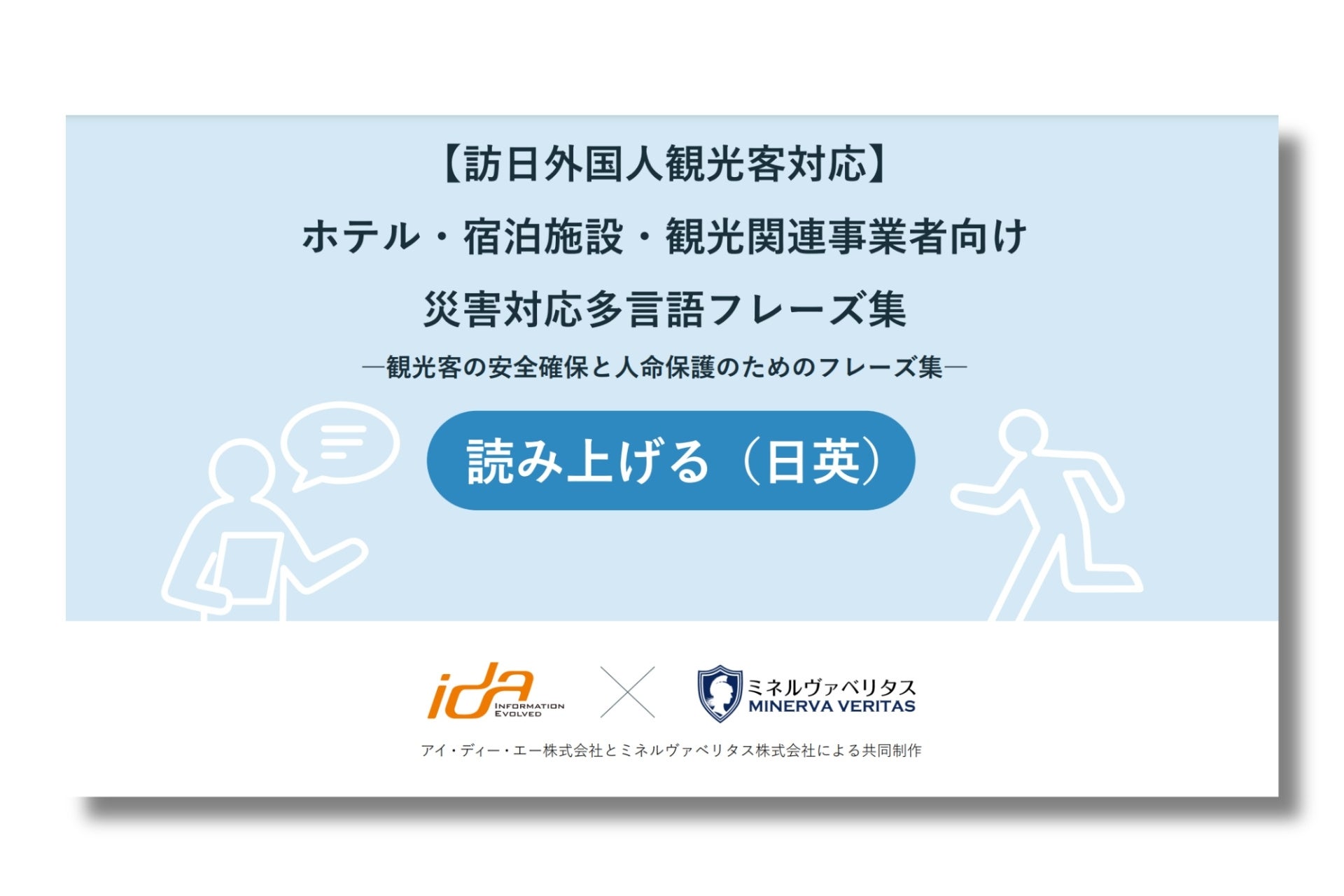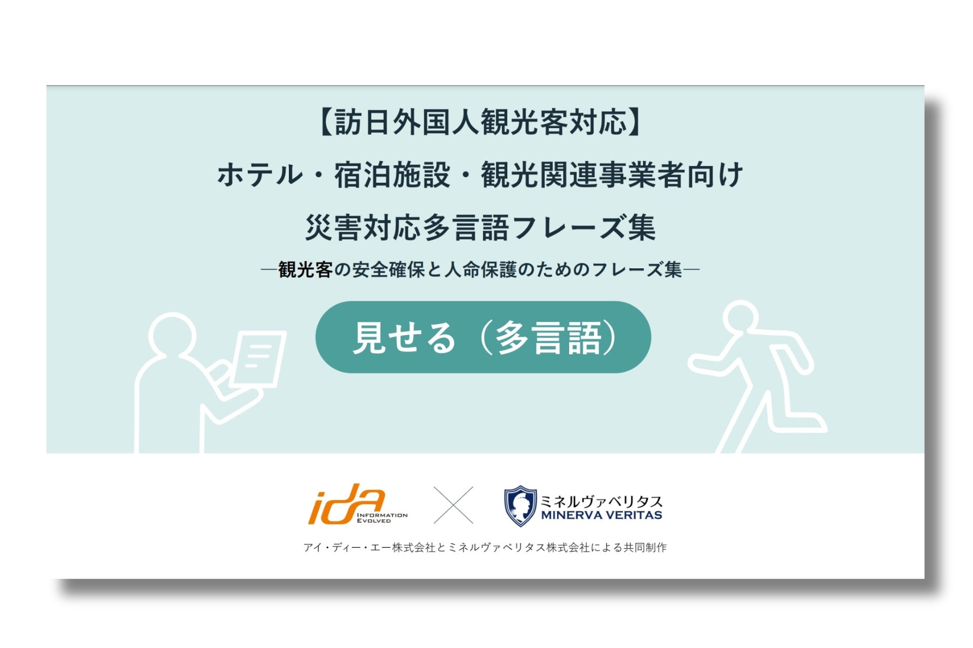 企業向けの多言語翻訳、パンフレット・カタログやウェブサイトの多言語版制作を提供するアイ・ディー・エー株式会社(本社:大阪市北区太融寺町、代表取締役社長:安藤 文彦)と、外資系企業・国内企業・官公庁を対象に各種リスクマネジメントならびにクライシスマネジメントに関するコンサルティングを手掛けるミネルヴァベリタス株式会社は、「ホテル・宿泊施設・観光関連事業者向け災害対応多言語フレーズ集」を無料で配信することをお知らせいたします。