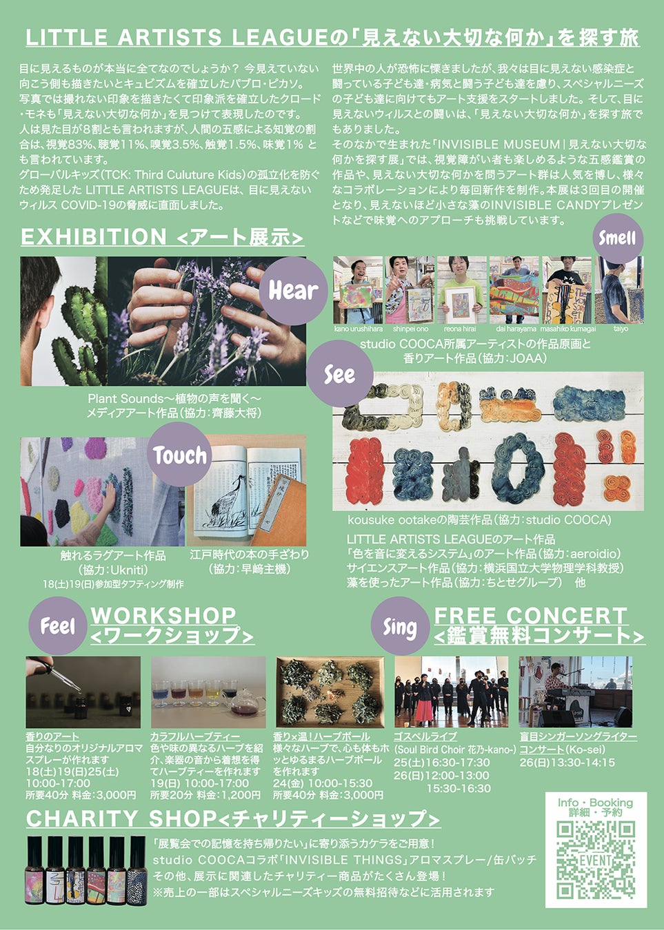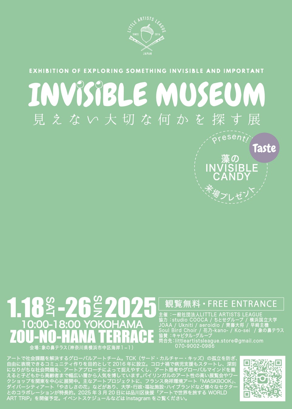 本展示は、2023年2月に開催した「INVISIBLE MUSEUM|目に見えない大切な何かを探す展」の反響を受け、第2回目は横浜トリエンナーレの応援プログラムとして実施、今回は第3回目の開催となります。アート展示と体験型ワークショップの他、盲目シンガーやゴスペルのライブを予定し、展示と関連した「見えないほど小さな藻のINVISIBLE CANDY」の来場者プレゼントもご用意し、みなさまのご来場をお待ちしております。