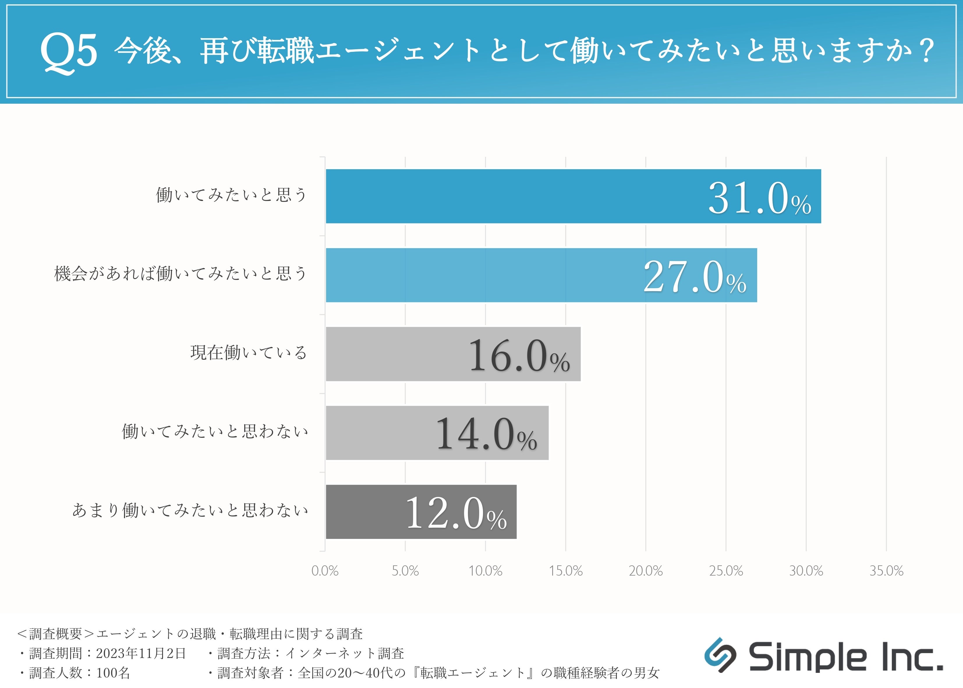 再び転職エージェントとして働いてみたいか伺ったところ、「働いてみたいと思う(31.0%)」「機会があれば働いてみたいと思う(27.0%)」と、実に6割近くの方がこの先も働きたいと考えていることがわかりました。