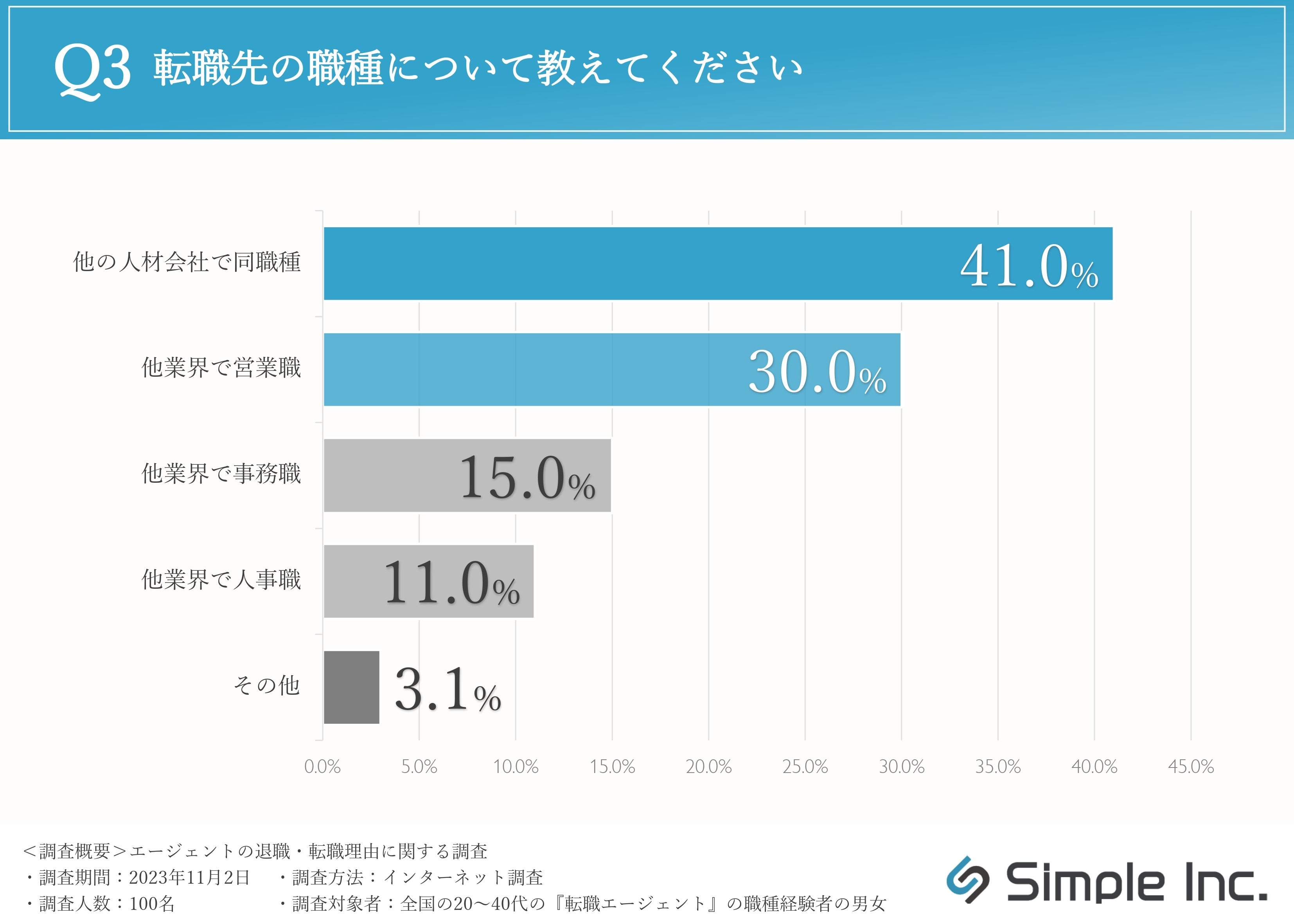 そこで、転職先の職種について伺ったところ、「他の人材会社で同職種(41.0%)」と回答した方がトップで、転職後もエージェントを続けている方が約4割いることがわかりました。