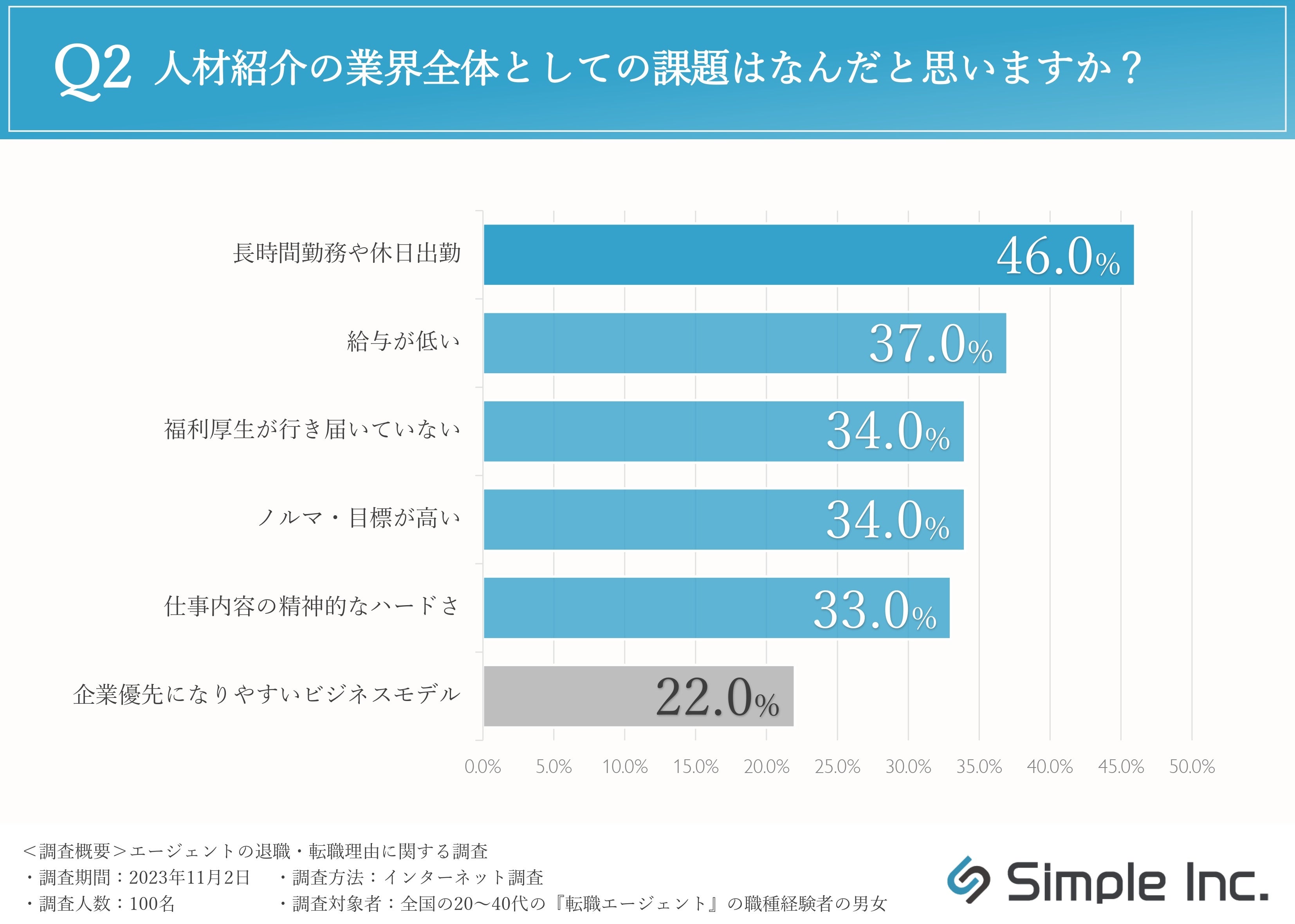 次に、人材紹介の業界全体としての課題について伺ったところ、「長時間勤務や休日出勤(46.0%)」「給与が低い(37.0%)」という前問の退職理由とほぼ近しい回答結果が集まりました。
