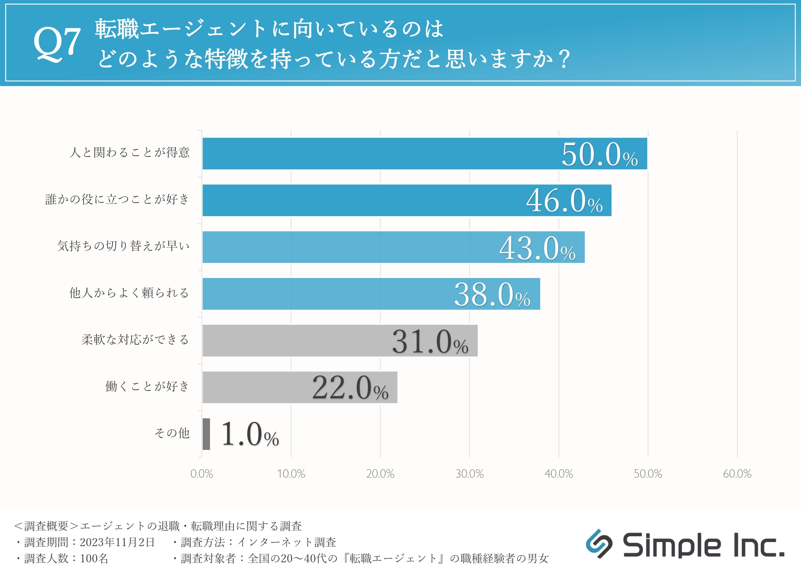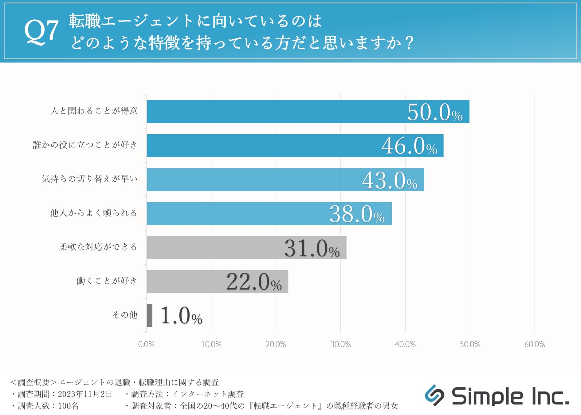 最後に、転職エージェントに向いているのはどのような特徴を持っている方なのか伺ったところ、「人と関わることが得意(50.0%)」「誰かの役に立つことが好き(46.0%)」「気持ちの切り替えが早い(43.0%)」という回答が集まりました。
