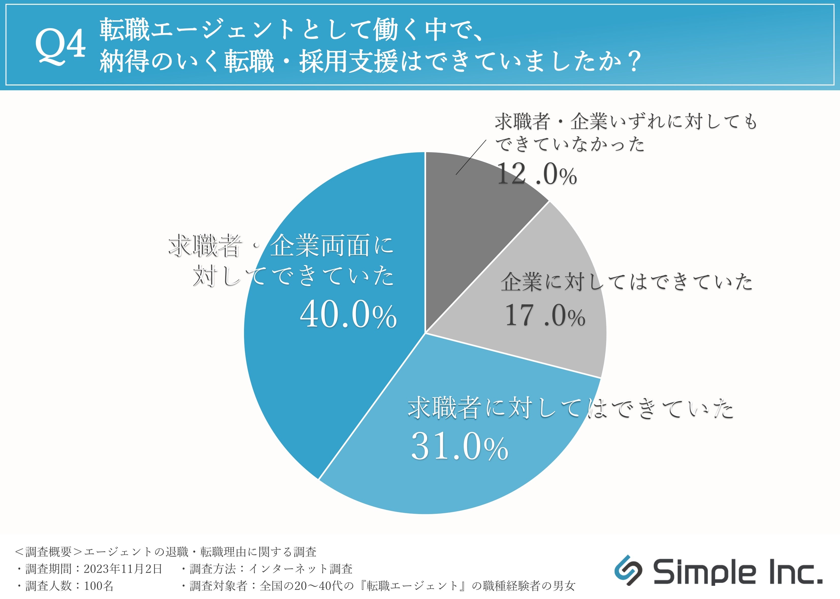 転職エージェントとして働く中で、納得のいく転職・採用支援ができていたのか伺ったところ、「求職者・企業両面に対してできていた(40.0%)」という回答は半分以下に留まりました。