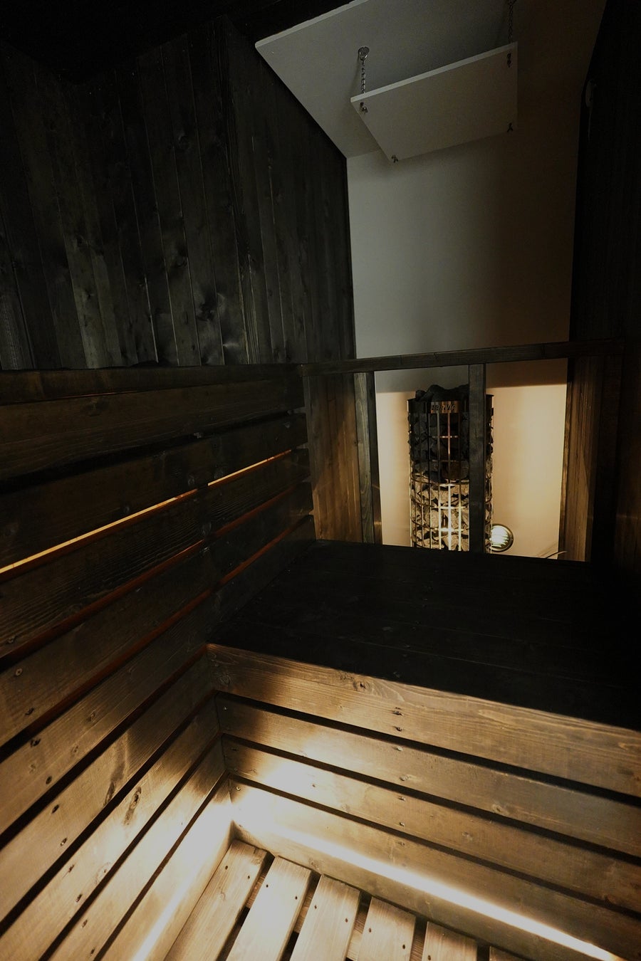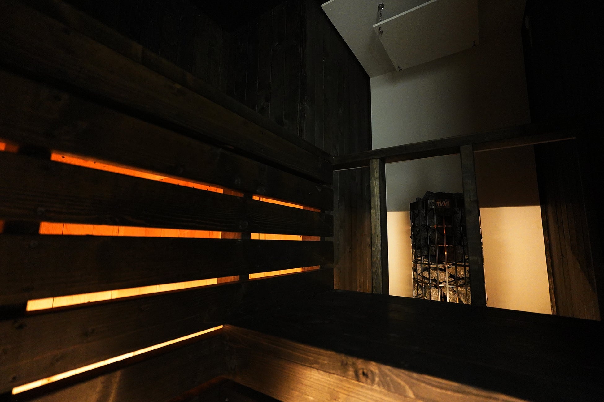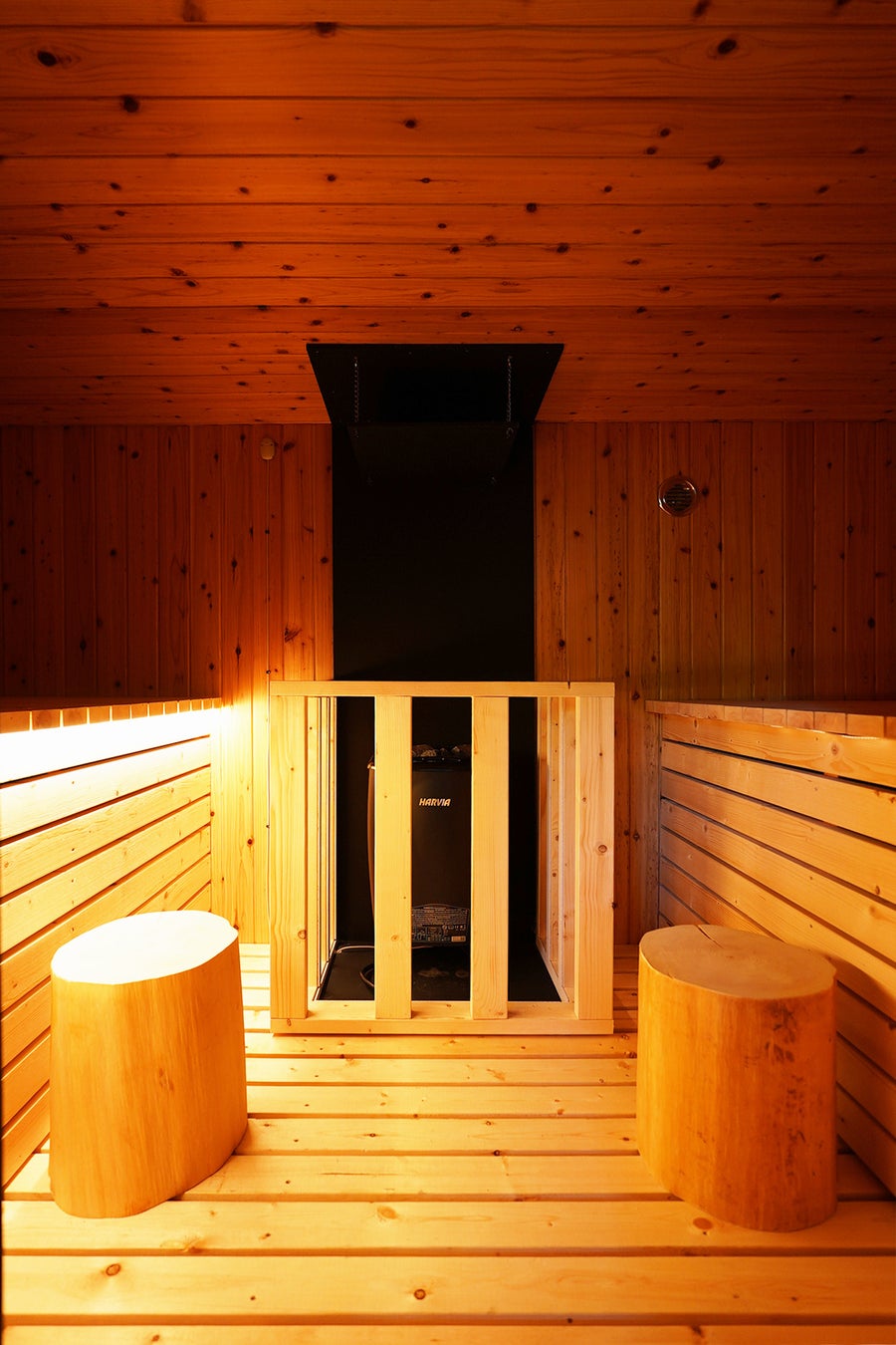 書院造の平屋をリノベーションした2名用の別邸です。室内の一角に、黒い壁で統一された小さなサウナ室を設置し、洞窟のような暗がりと熱で感覚が内側に向かう“瞑想サウナ”体験を提供します。HARVIAのタワー型ストーブを採用し、柔らかな熱とロウリュを楽しめる仕様に仕上げました。