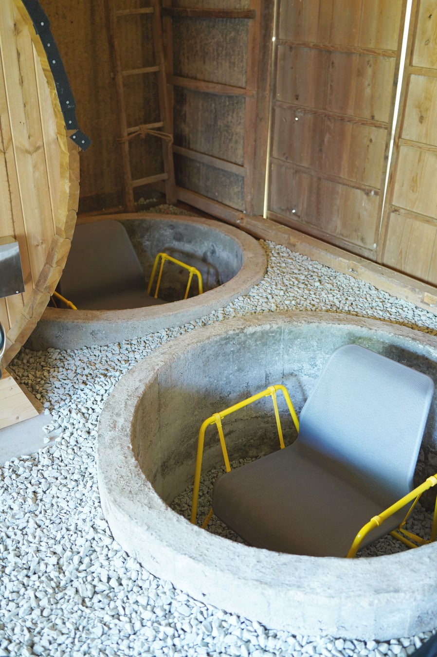 納屋の一部には、籾殻を保管していた小さな“縦穴”のようなスペースが残されており、一年を通してひんやりとした空気がたまる天然のクールスポットに。そこに身を預けると、大地に抱かれるような静けさに包まれます。専用キッチンもあり、地元食材を持ち込んで“サウナのある別荘”感覚で滞在できます。
