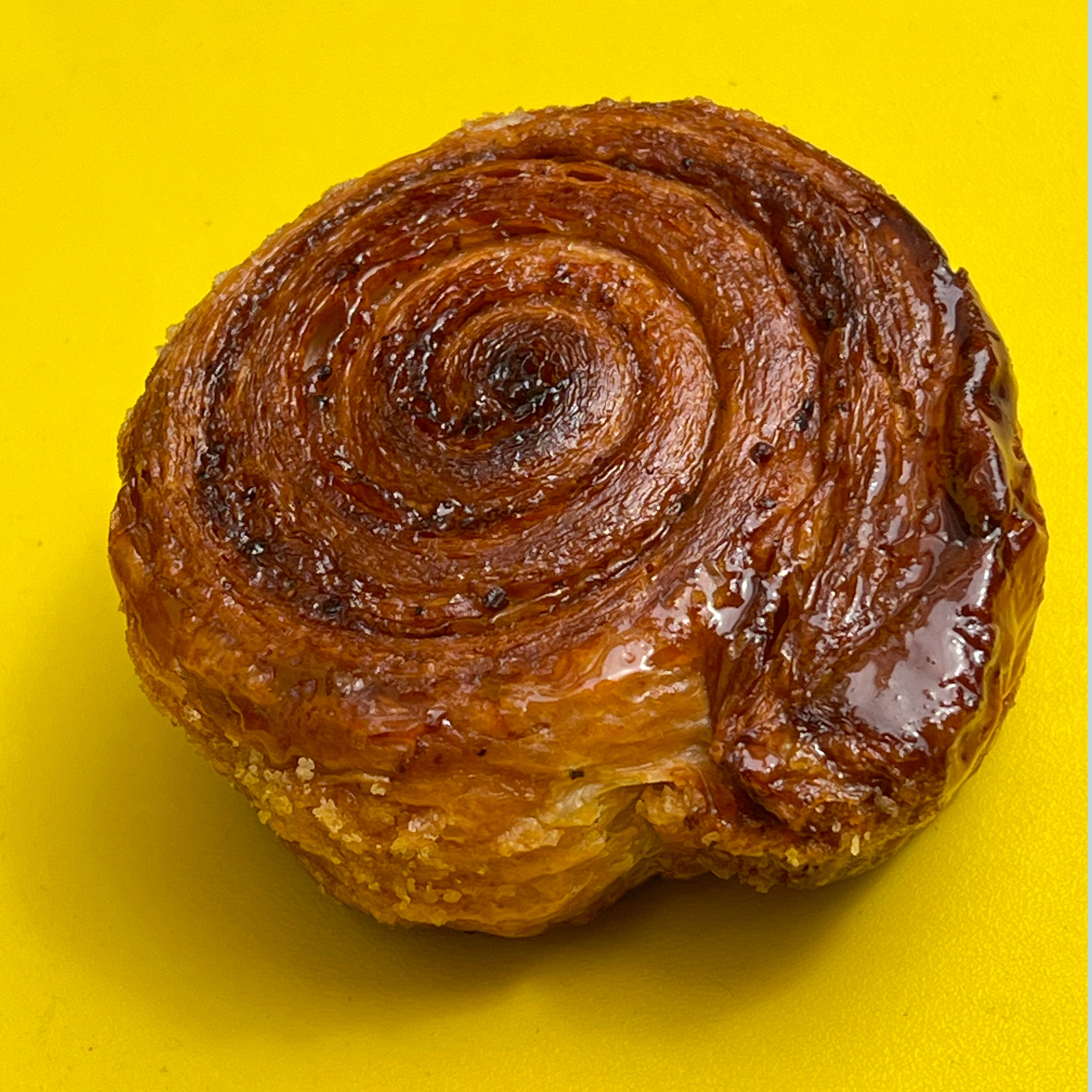 トンカ豆の香り漂うクイニーアマン。トンカ豆は世界中で上質な香りの原料として使われているスパイスで、バニラに桜の葉や桃の花を加えたような甘く上品な香りを持ちます。クイニーアマンは元々フランスブルスターニュー地方のビエノワズリー発祥で、砂糖を生地に練り込んだクロワッサンです。表面にはカラメルが付いていて、パリパリサクサクの食感。中はしっとりしていて甘さと塩味のバランスが良く、そこにトンカ豆の香りが加わり、とろけるようなバターの香りと混ざり魅力的です。