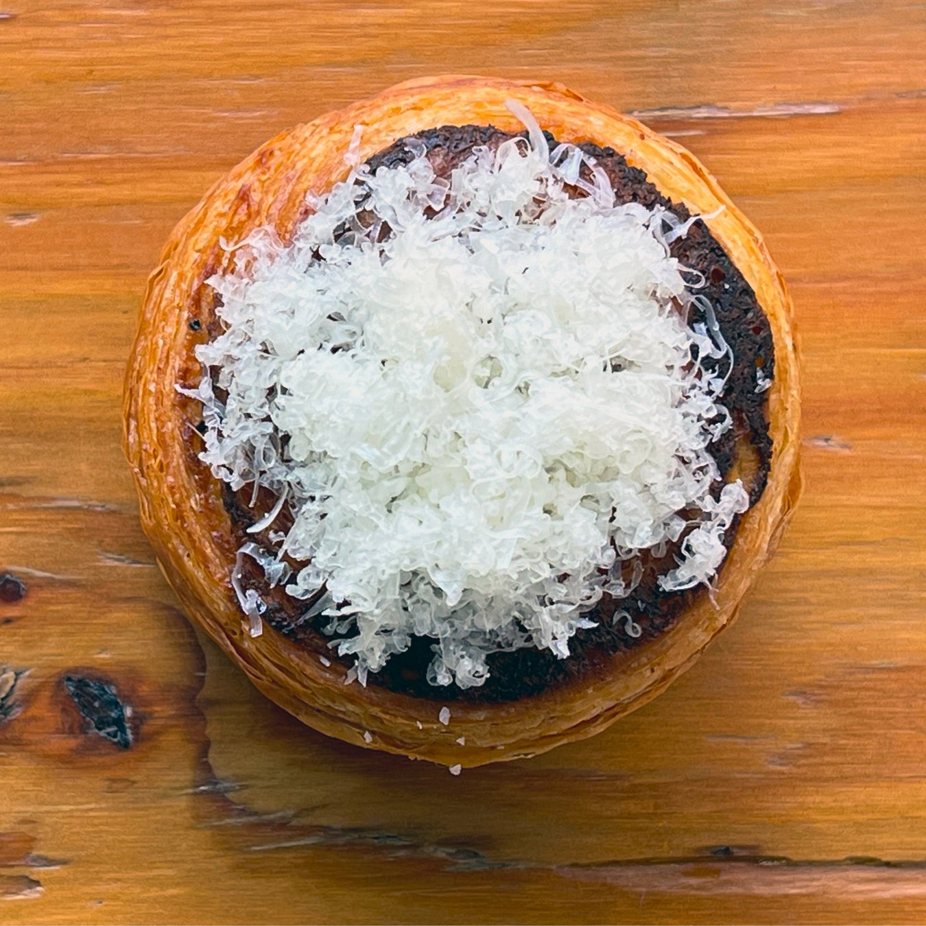 イタリア語でカチョ(cacio)とはチーズ、ぺぺ(pepe)は胡椒と言う意味で、「カチョエペペ」とは、チーズ、黒コショウを用いたイタリアはローマ発祥のパスタ料理です。シンプルなチーズと黒コショウのテーストをクロワッサン生地に落とし込み、B²スタイルのエスカルゴのようなくるっと丸いロールにして焼き上げ、仕上げにパルミジャーノ・レッジャーノチーズをふんわりと乗せています。