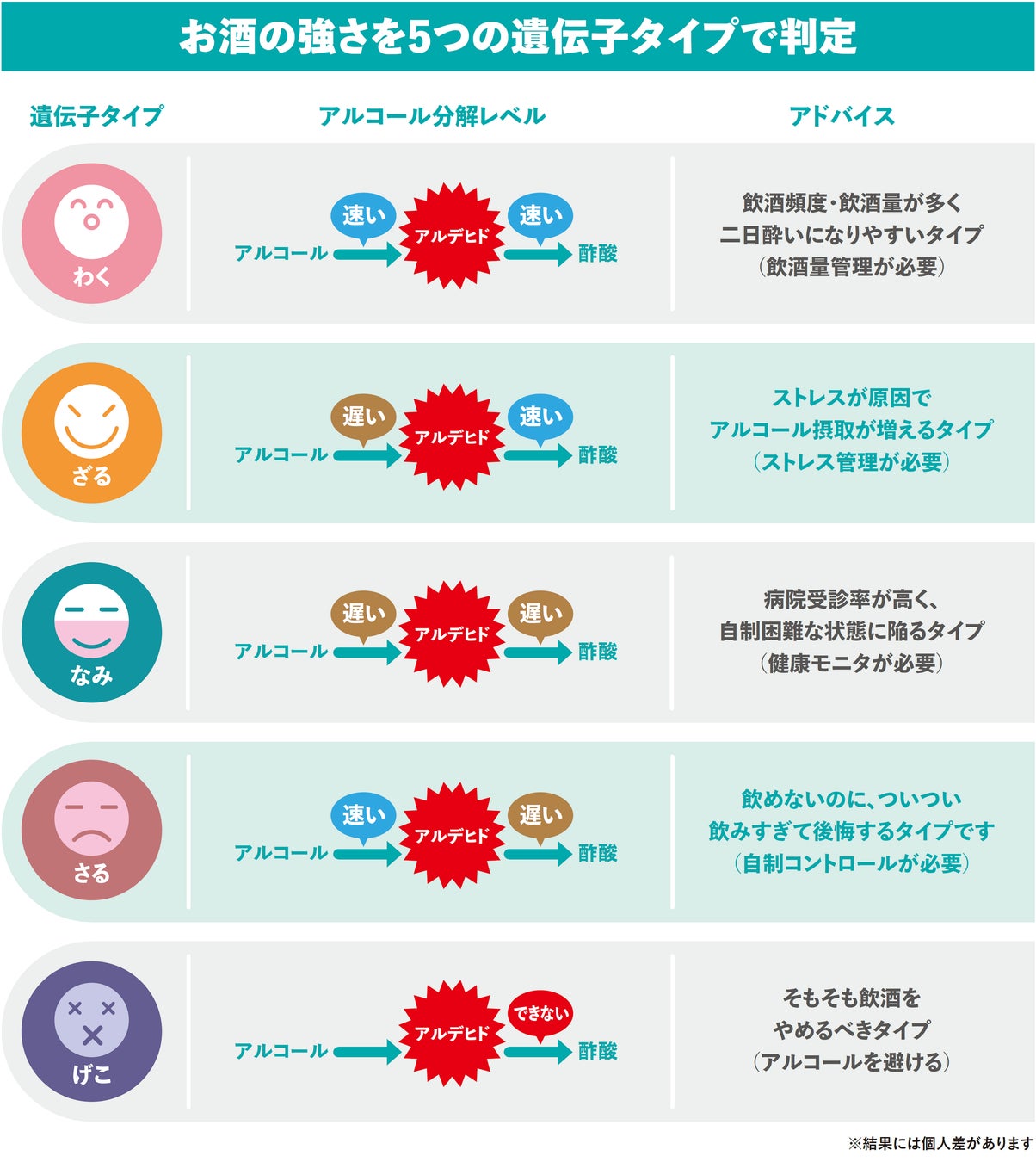 遺伝子検査なので従来のパッチテストよりも正確です。アルコール代謝に関わる2つの重要な酵素(ADH1B、ALDH2)の遺伝子を分析し、その結果を5つのタイプに分類します。疾病リスクもわかる検査レポートで、お酒との上手な付き合い方がわかります。