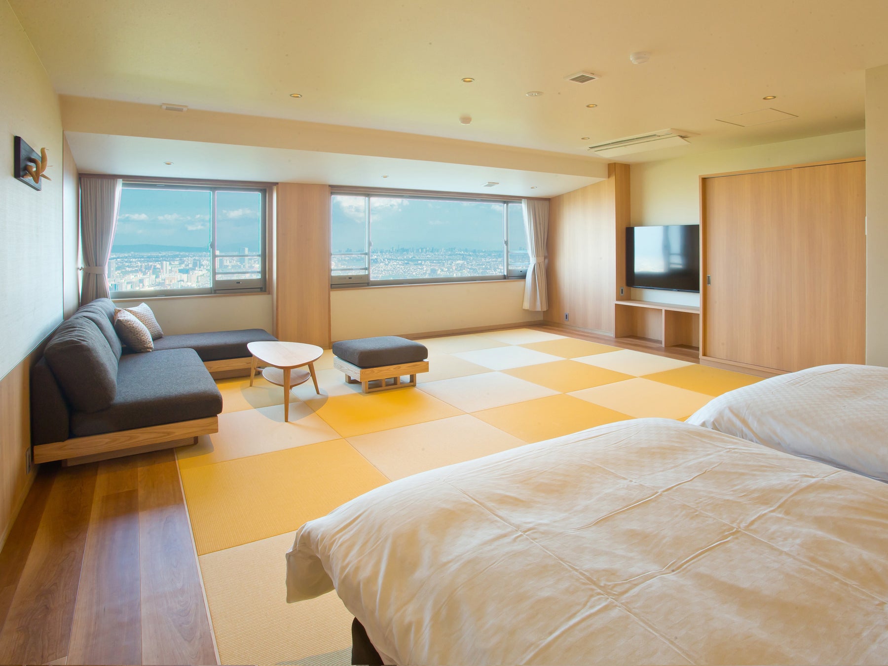 広々とした45㎡の空間に27㎡の露天風呂を含むテラスが備わっています。建物の角部屋に位置しているためテラスからは大阪の街並みと箕面の自然、どちらもお楽しみいただけます。