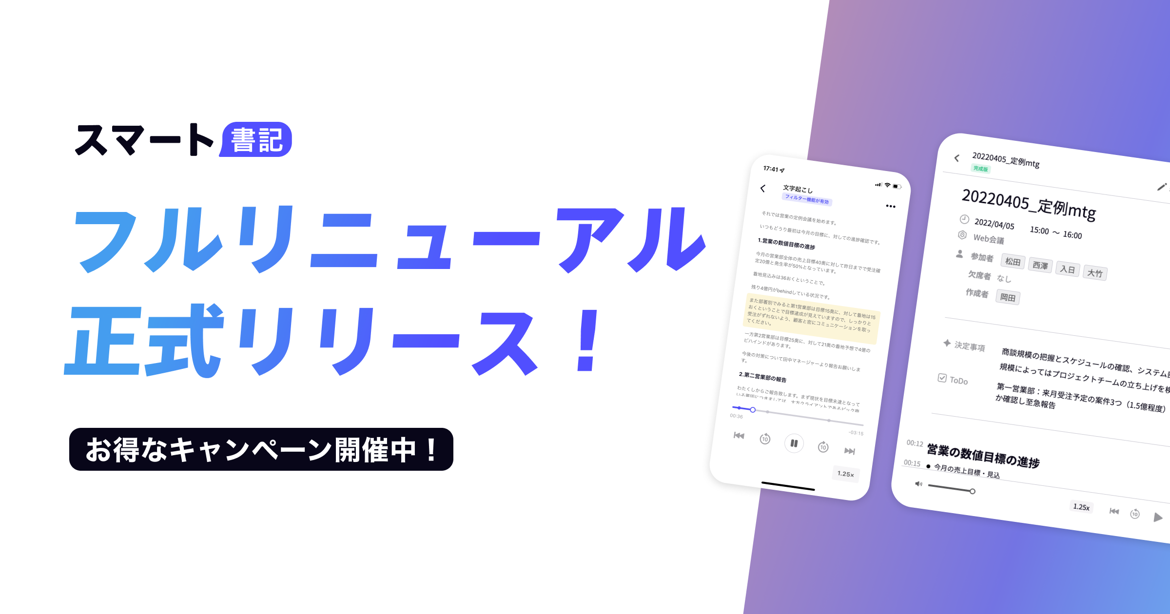 音声自動文字起こしサービス「スマート書記」をフルリニューアルし、音声を活用した議事録作成支援ツールとして正式リリース