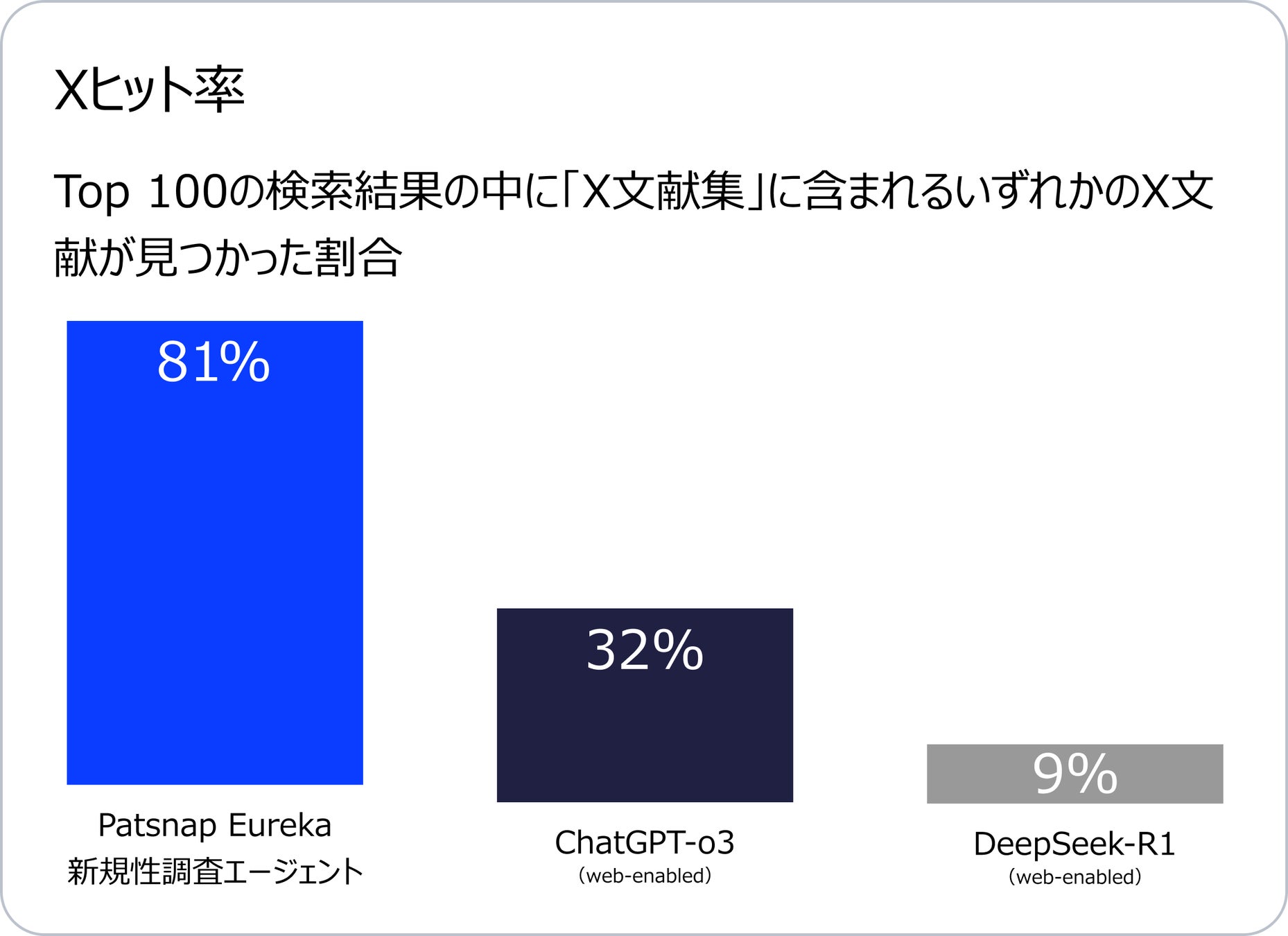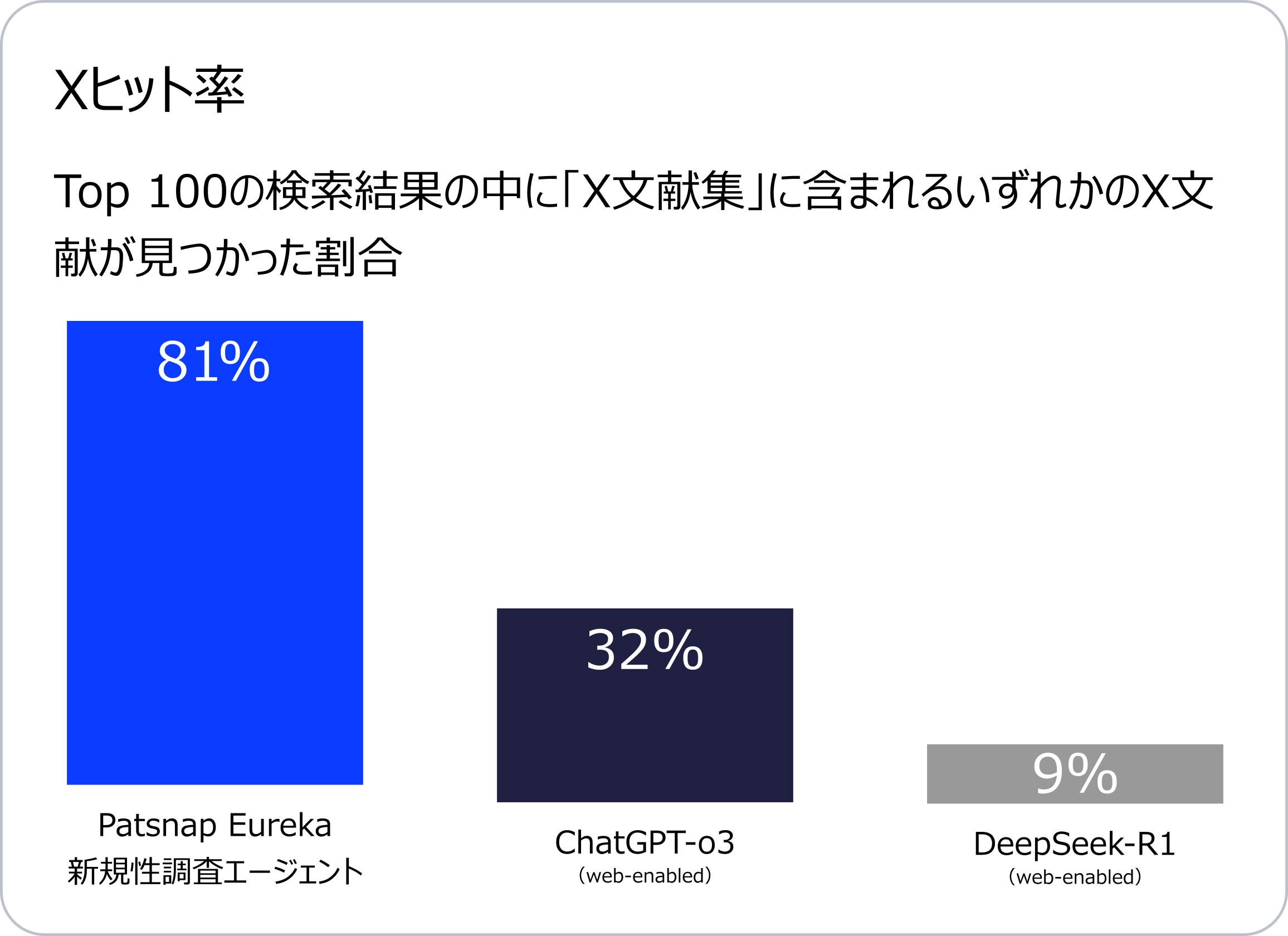 その結果、Patsnap EurekaはTop100結果におけるX検出率・Xリコール率でそれぞれ81%・36%を記録しました。これは、汎用モデルに比べてより正確にX文献を特定し、より漏れなく拾い上げられるAIであることを示しています。