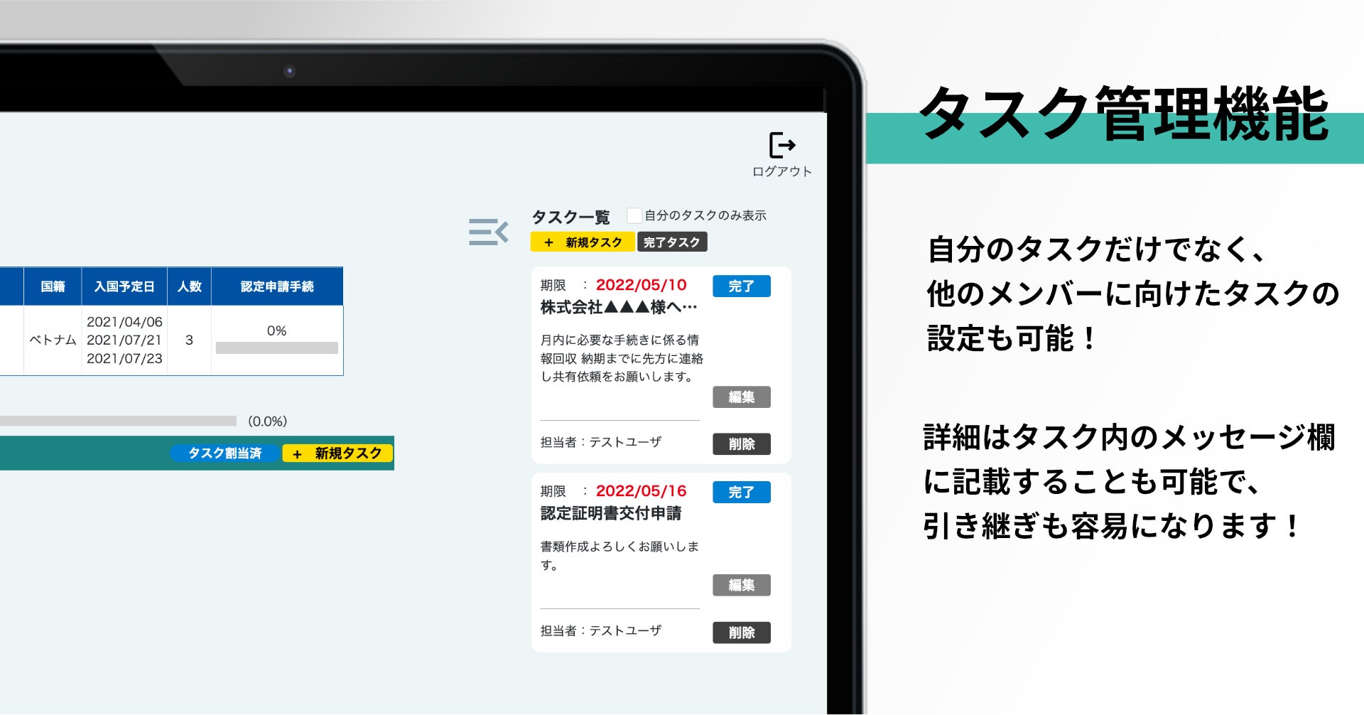 実際の業務フローに合わせて進捗を管理でき、画面の流れに合わせて作業するだけで簡単に業務を進めていただけます(進捗管理)。これにより、監理団体様や登録支援機関様における業務効率をアップさせ、新しいご担当者様にもわかりやすく、すぐにご活用いただけるため、人材不足の課題解決にも貢献いたします。