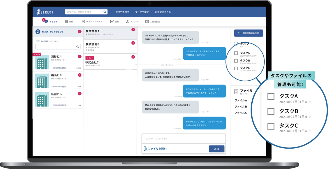 オフィス移転では「対面アポ」「電話連絡」「紙の資料提案」などで取引をすることが未だに一般的で、情報が集約されず移転情報の管理が煩雑でした。「SERECT」では、物件ごとのチャットルーム内で「やり取り」「提案資料」「実行タスク」が全て一元管理されており、煩雑だった移転業務の案件管理を効率化することができます。