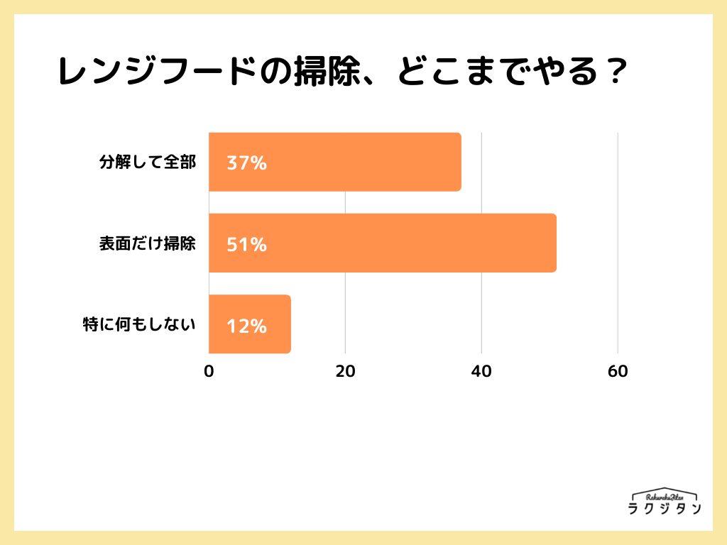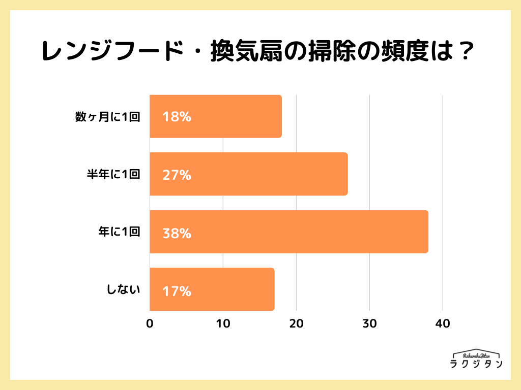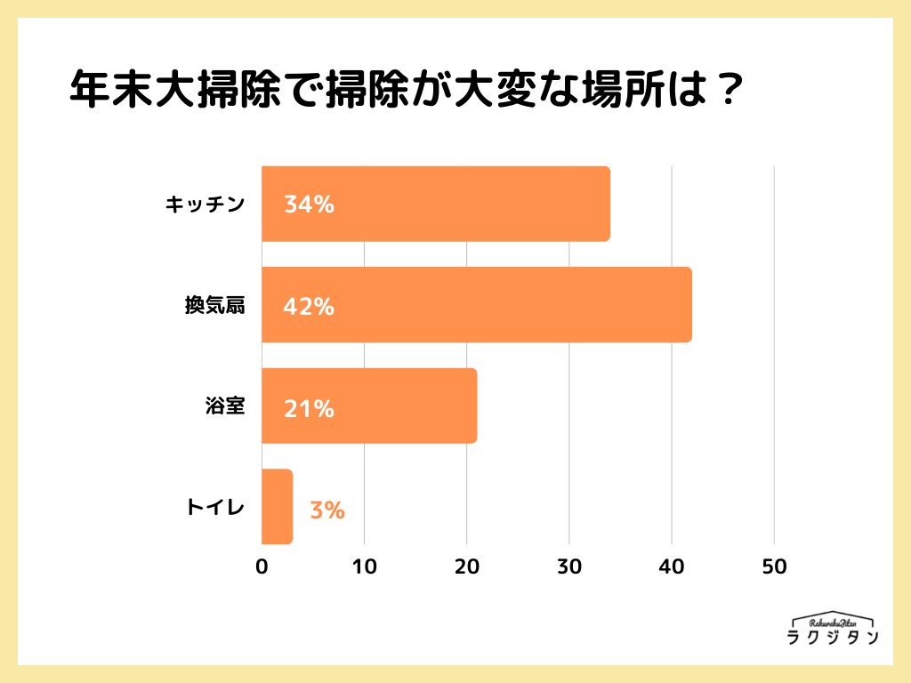 掃除が大変だと感じる場所は、ダントツで「換気扇(レンジフード)」42%でした。年に1回、表面のみを掃除する人が大半のようで、分解の大変さがネックになっているようです。