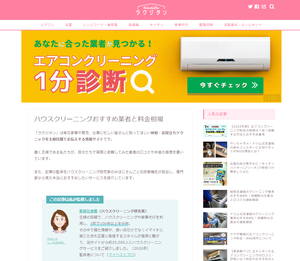 主婦の目線で、ハウスクリーニングや家事代行を利用し、3年で100件以上を分析。