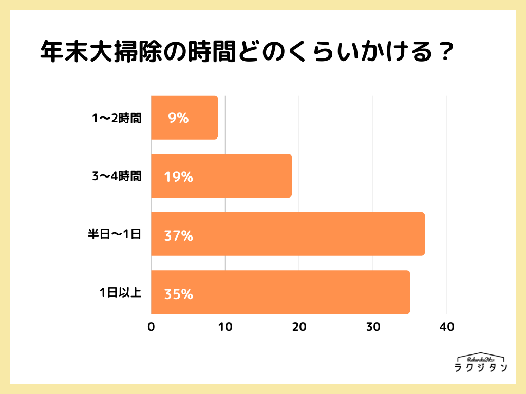 大掃除にかかる時間は、まる1日かそれ以上の人が72%で、掃除をする人は徹底的にやる傾向にあるようです。