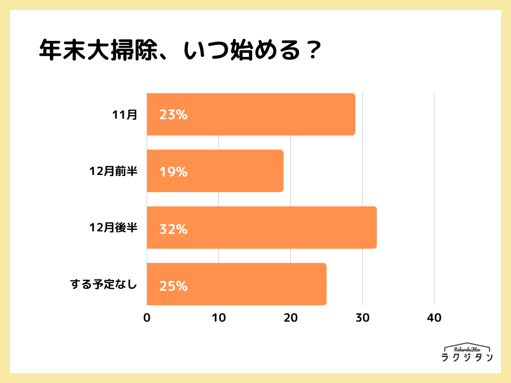 12月後半から掃除を始める人が32%と多数を占める一方で、しない人は25%となり、大掃除を最初から予定しない人が一定数いることが分かりました。