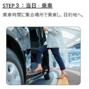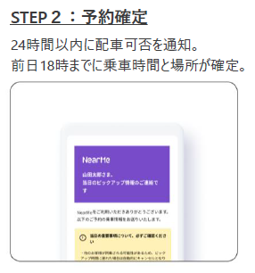 予約方法 | 以下WEBサイトよりお申込みください。 当日は、予約受付メールに記載された時間と場所にてご乗車ください。 |