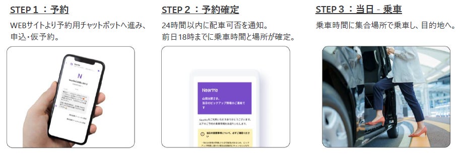 本サービスは、出発地から目的地までの移動をドアツードアで結ぶ移動のシェアサービス「NearMe」のプラットフォームを活用し、サービス利用希望者同士がタクシーをシェアすることによって、「おトクに、快適に」直行することを実現するサービスです。移動・交通課題の解決において生活者、交通事業者、地域社会「三方良し」の実現を目指します。