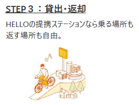 ステーション検索 | ステーションの検索および利用方法の確認は、 「HELLO CYCLING」のHPまたはアプリにてご確認ください。 ※アプリの地図上に表示されているステーション (全国約7,000ヶ所、2023年9月時点)であれば、全国どこでも貸し出し・ 返却が可能で、使いたいときに、使いたいだけ、便利に利用することができます。 「HELLO CYCLING」 ・HP:https://www.hellocycling.jp/ ・アプリダウンロード:https://www.hellocycling.jp/app/openapp |