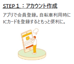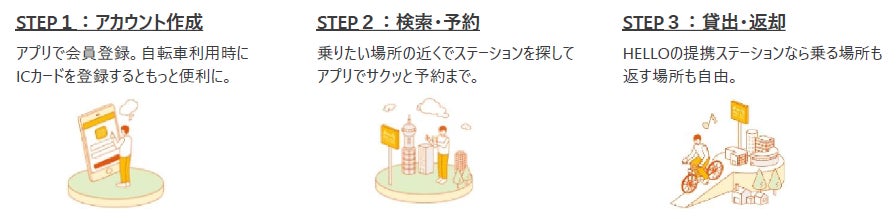 ご利⽤にあたっては、「HELLO CYCLING」アプリのダウンロードが必要となります。アプリで無料会員登録後、ステーションの検索や、⾃転⾞の予約から決済までを簡単に⾏うことができます。