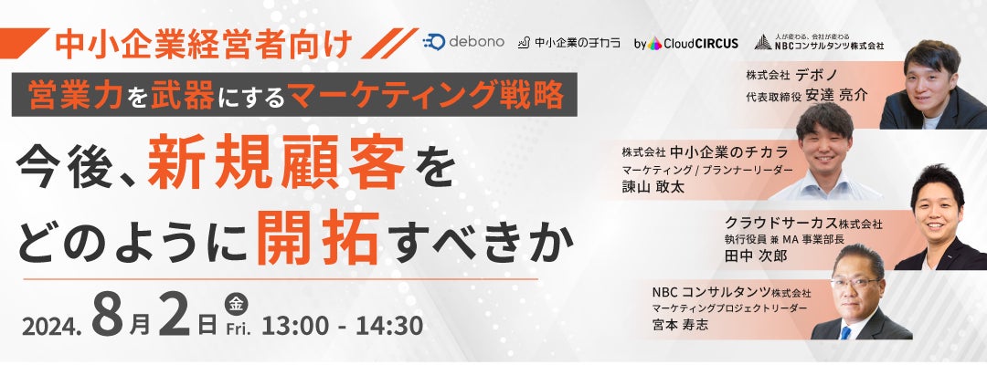 AI、ビッグデータを活用したマーケティング事業を行う株式会社デボノ(本社:東京都港区、代表取締役:安達 亮介)は、株式会社中小企業のチカラ、クラウドサーカス株式会社、NBCコンサルタンツ株式会社と4社共同で『<中小企業経営者向け>「営業力」を武器にするマーケティング戦略|今後、新規顧客をどのように開拓すべきか』をテーマに8月2日(金)13時より、参加費無料のウェビナーを開催します。